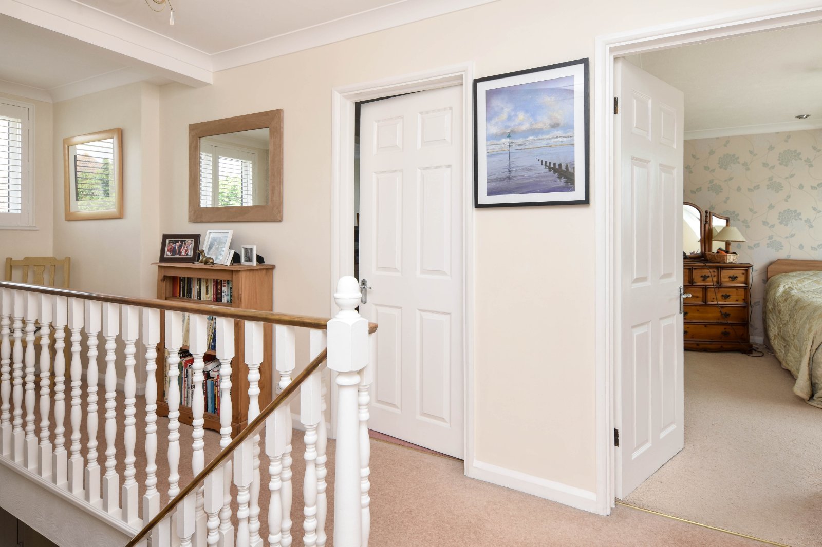 Generous first floor landing featuring a uPVC double glazed window to the front aspect, beautifully complemented by bespoke fitted shutter blinds. Attractive spindle balustrade overlooking the stairwell. Panelled door to airing cupboard with fitted linen shelving, together with a further half-height door providing useful access to eaves storage. Radiator. Decorative coving to the smooth plastered ceiling with loft access via pull-down ladder.