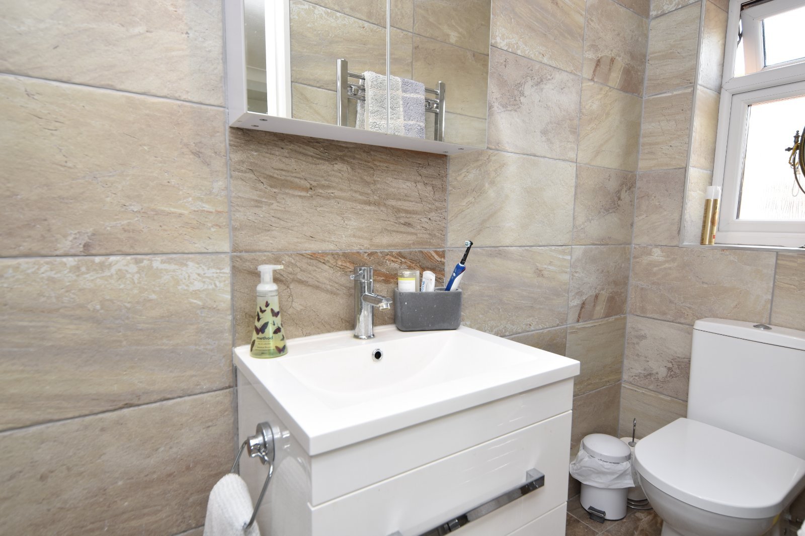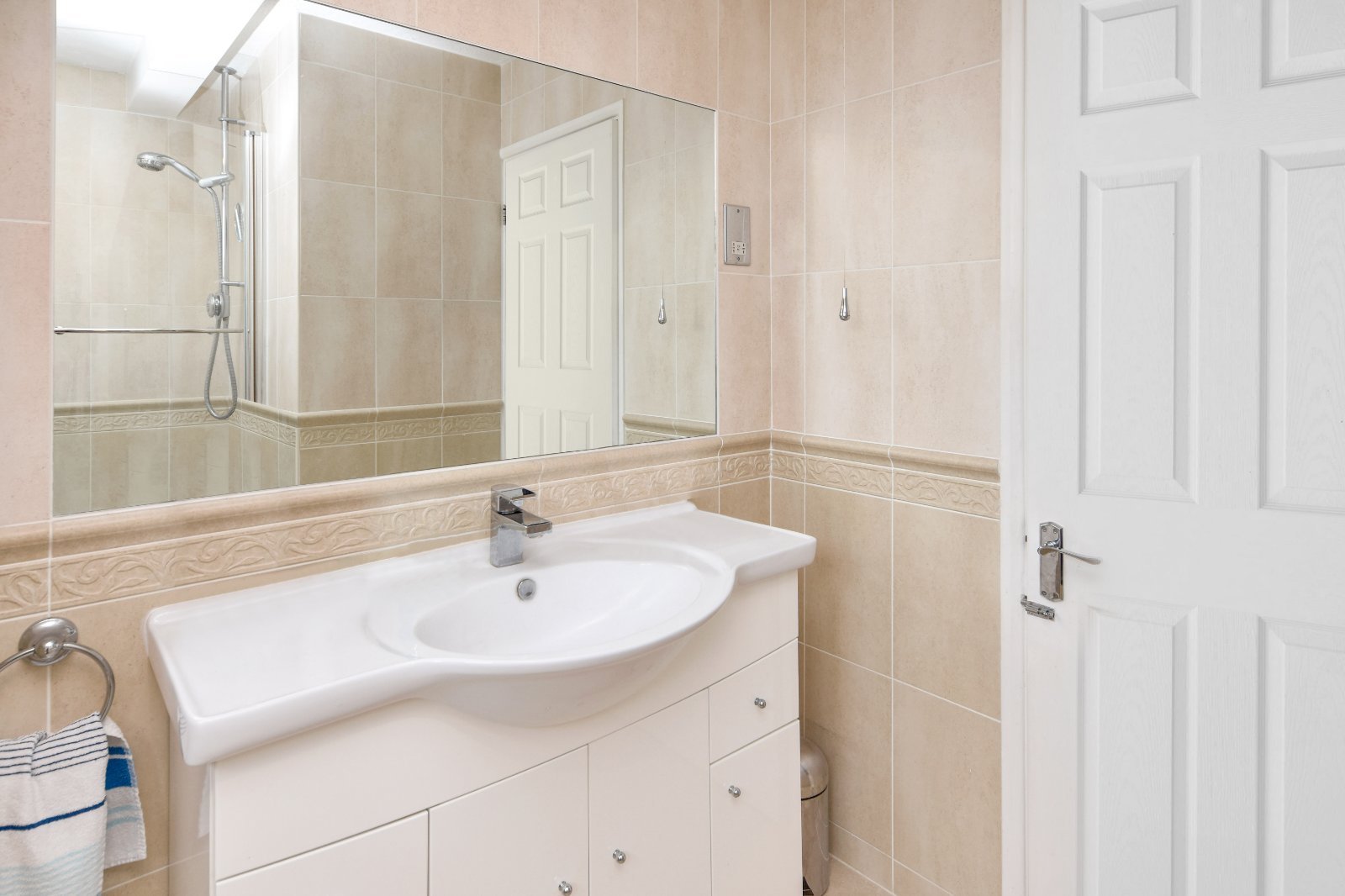Obscure uPVC double glazed window to the front elevation. The room is appointed with a contemporary two-piece suite comprising a dual flush WC and pedestal wash hand basin with mixer tap. Ladder-style heated towel rail. Part tiled walls to dado height with coordinating tiled flooring. Decorative coving to a smooth plastered ceiling.