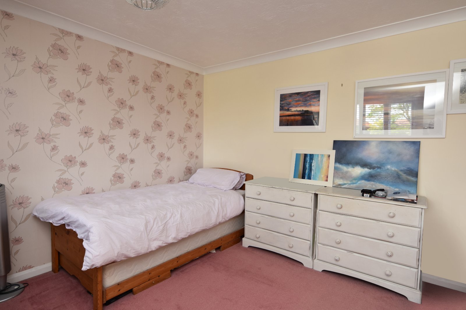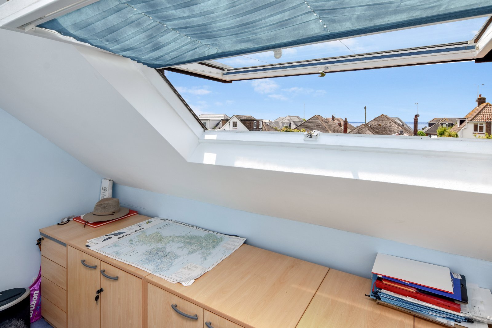 A well-positioned double glazed Velux-style skylight to the rear elevation frames far-reaching rooftop views towards the Thames Estuary, drawing in excellent natural light. Further features include a radiator and decorative coving to the textured ceiling, enhancing the room’s overall finish.