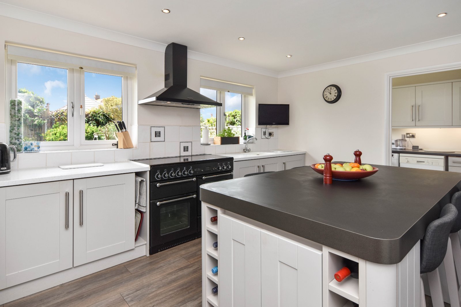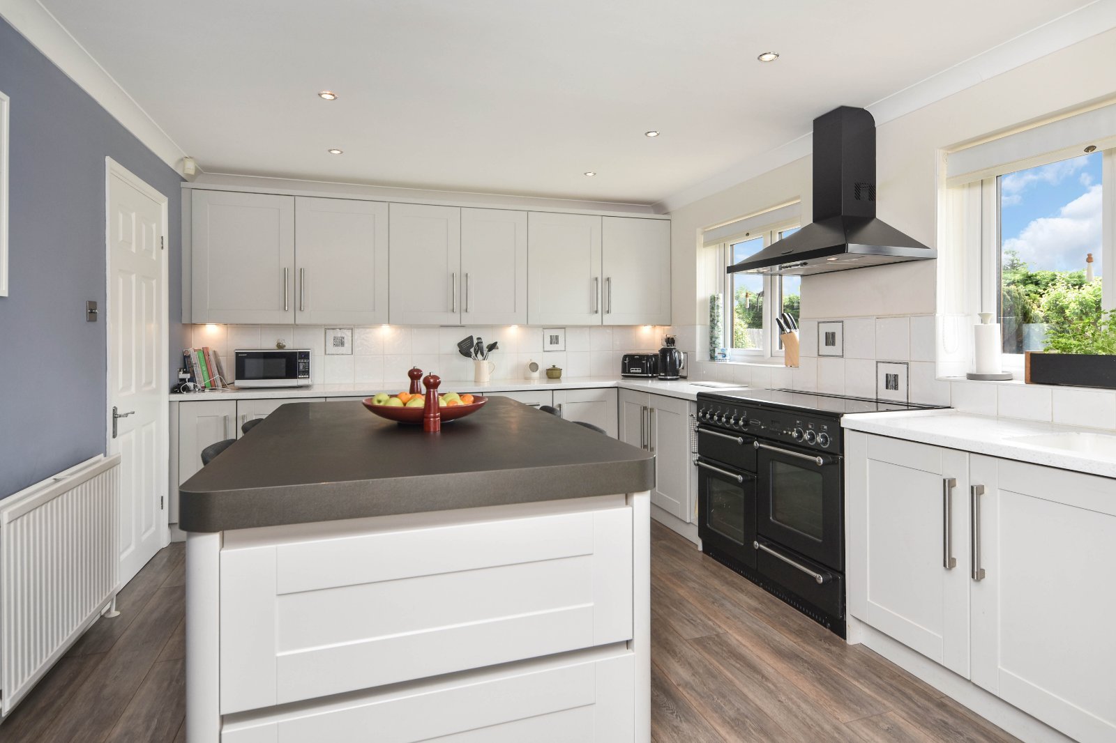 Pair of uPVC double glazed windows frame attractive rear garden views and flood the Kitchen with natural light. Beautifully appointed with an extensive range of fitted cabinetry and granite work surfaces incorporating a single bowl sink with mixer tap and drainer. A freestanding Rangemaster five-burner gas cooker (to remain) sits beneath a striking double-width extractor hood with coordinated splashback tiling.