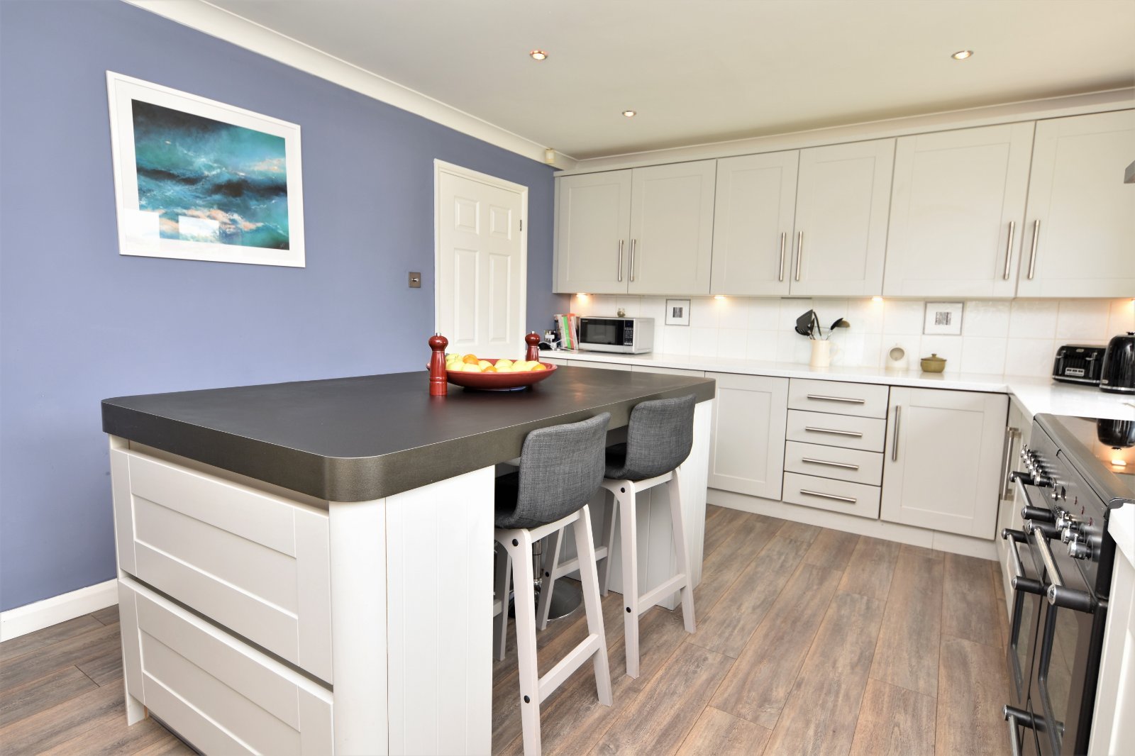 A substantial central island forms the heart of the room, offering breakfast seating, generous storage and integrated wine racking. Under-cabinet lighting, wood-effect flooring, radiator and recessed ceiling lighting complete this stylish and highly functional space. Panelled door to: