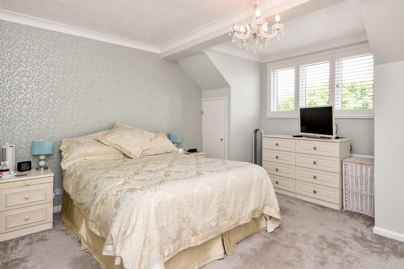 An impressive and beautifully appointed principal bedroom enjoying a square bay window to the front aspect, fitted with made-to-measure plantation shutters that enhance both privacy and style. The room is complemented by a comprehensive range of high-quality fitted wardrobes to one wall, offering excellent storage. Further benefits include a radiator, additional storage cupboard, and decorative coving to the ceiling. A panelled door provides access to the adjoining en-suite.