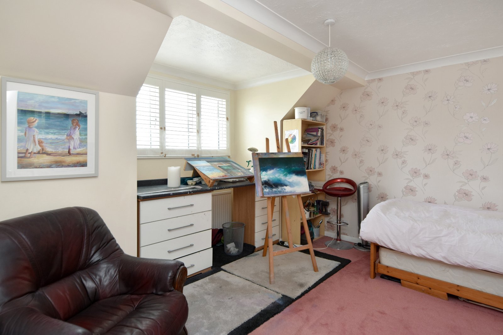 A well-positioned double glazed Velux-style skylight to the rear elevation frames far-reaching rooftop views towards the Thames Estuary, drawing in excellent natural light. Further features include a radiator and decorative coving to the textured ceiling, enhancing the room’s overall finish.
