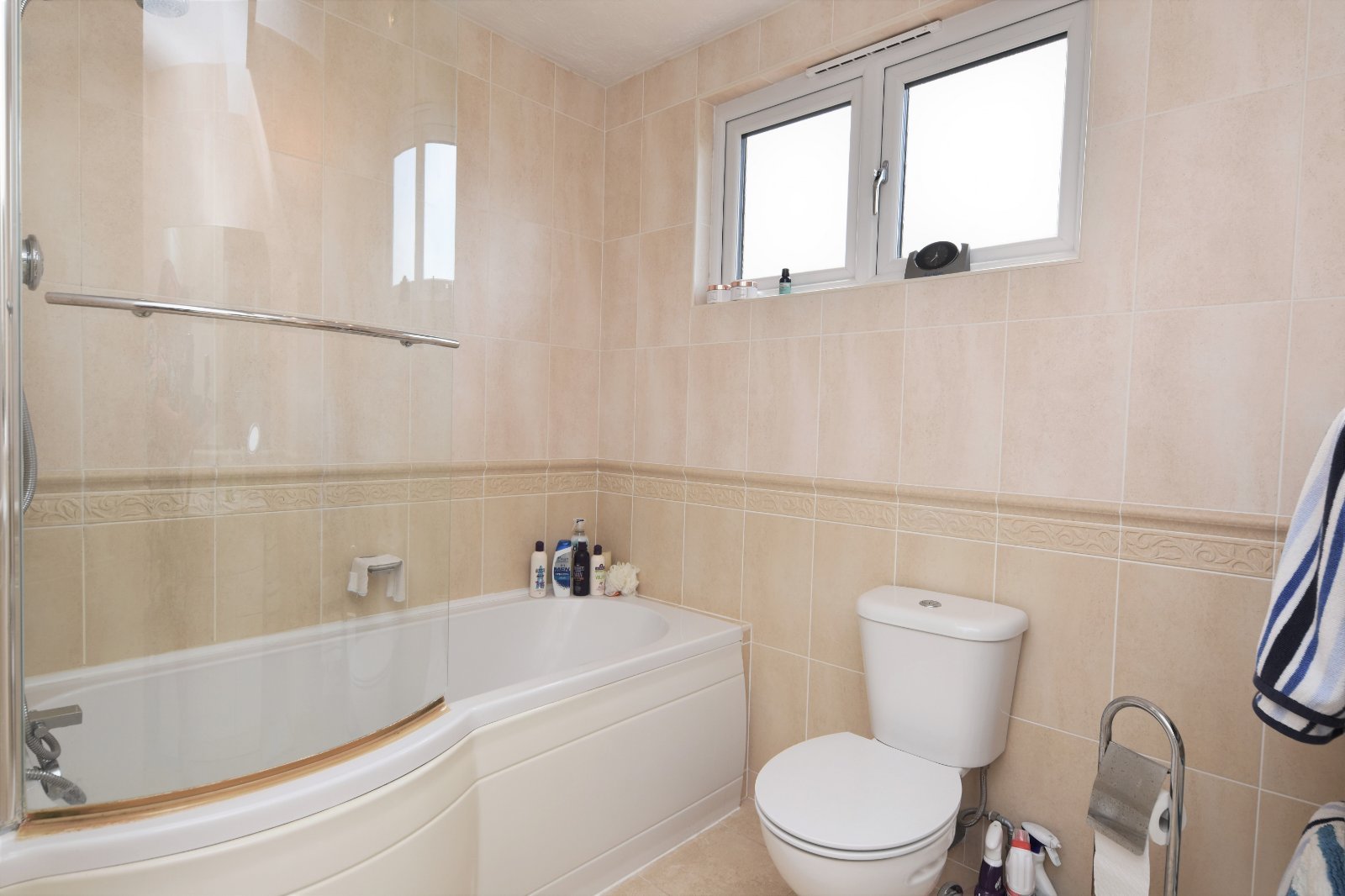 A well-appointed family bathroom featuring an obscure uPVC double glazed window to the rear aspect. The contemporary white suite comprises a panelled ‘shower bath’ with mixer taps and hand-held shower attachment, complemented by an integrated power shower with curved glazed screen. Further appointments include a dual flush WC and a vanity wash hand basin with mixer tap and useful storage beneath. The room is fully tiled to the visible walls with a coordinated tiled floor, enhanced by a wall-mounted mirror and shaver point. A ladder-style heated towel rail. Decorative coving to the smooth plastered ceiling completes this stylish and functional space.