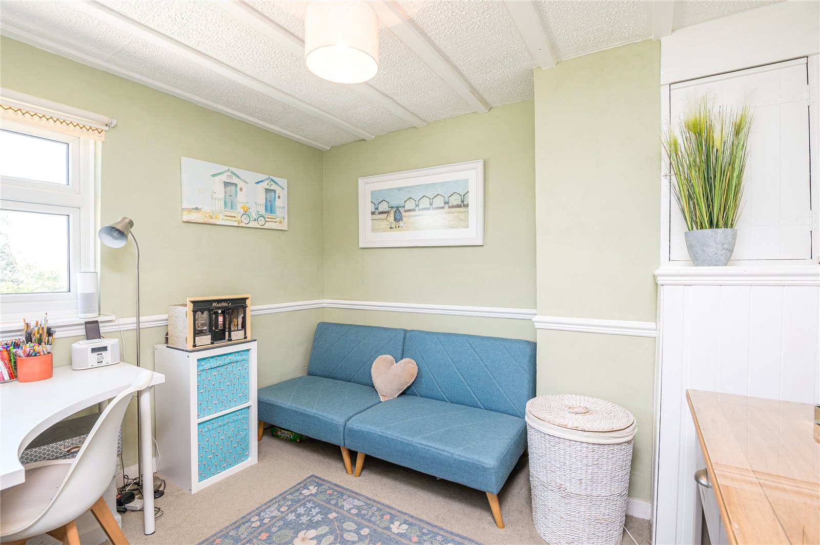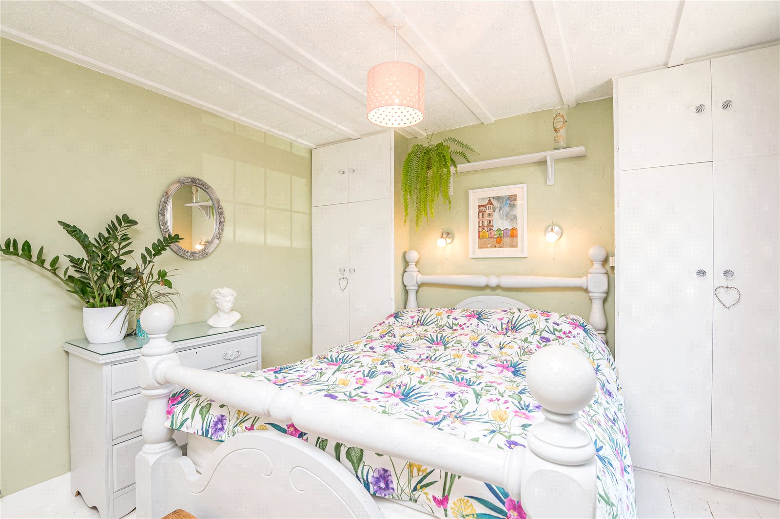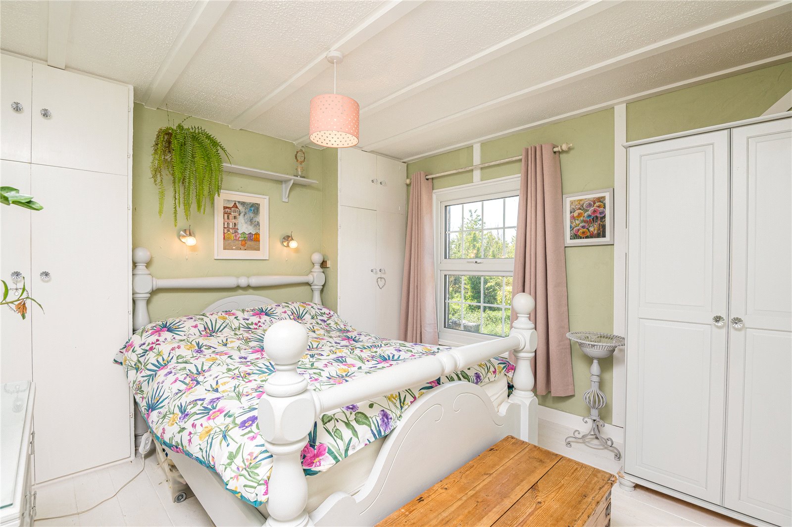 uPVC double glazed multi-pane sash style window to front. Hand painted timber flooring. Ornamental studwork and beams. Two twin built-in wardrobe cupboards with overhead storage. High Level skirting.