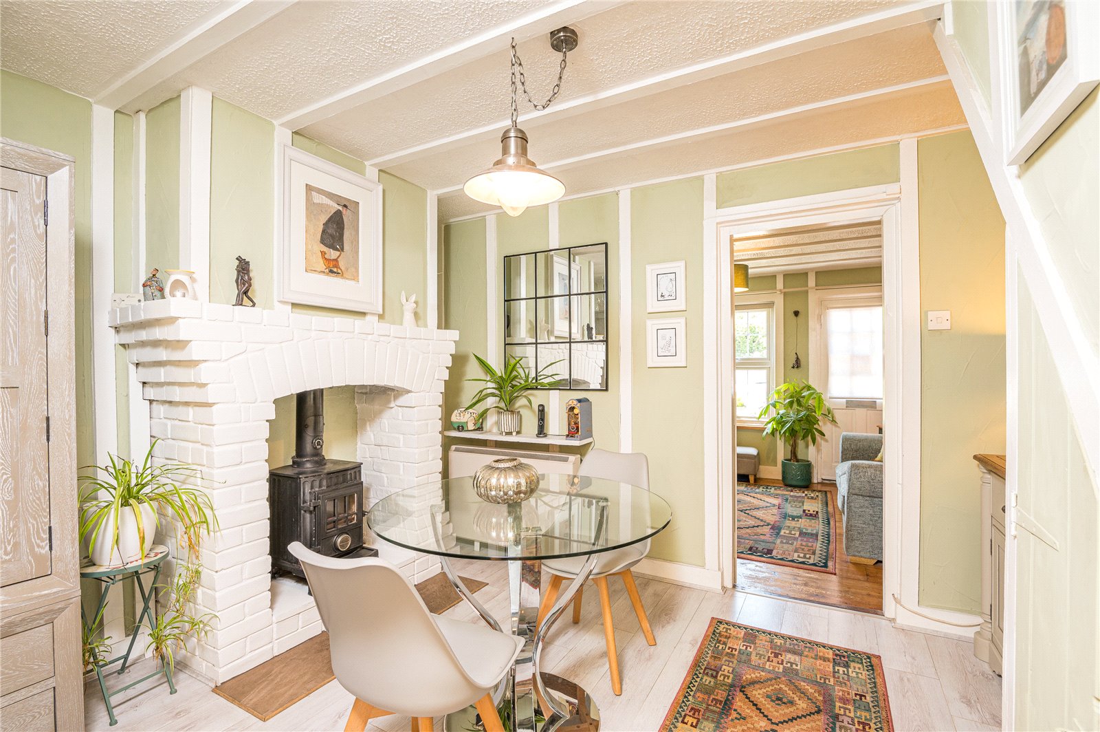 Light grey oak effect flooring. Flat heded openings lead through to Family Room/Sun Lounge and Kitchen. Wall mounted electric convection heater. Feature hand painted brick fireplace with inset cast iron multi-fuel burner with flue. Ornamental studwork and beams. Turned staircase to first floor landing with access to understairs storage cupboard.