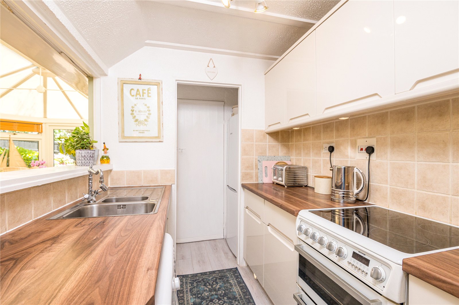 Obscure glazed door gives independent access from the front of the property. A pair of French doors gives access to the beautiful landscaped rear garden and twin double glazed windows with opening fan lites overlook the landscaped rear garden. Vaulted perspex refectorlite roof with opener. Wall mounted convection heater. Two wall light points, television aerial point and a double width open servery from the Kitchen.