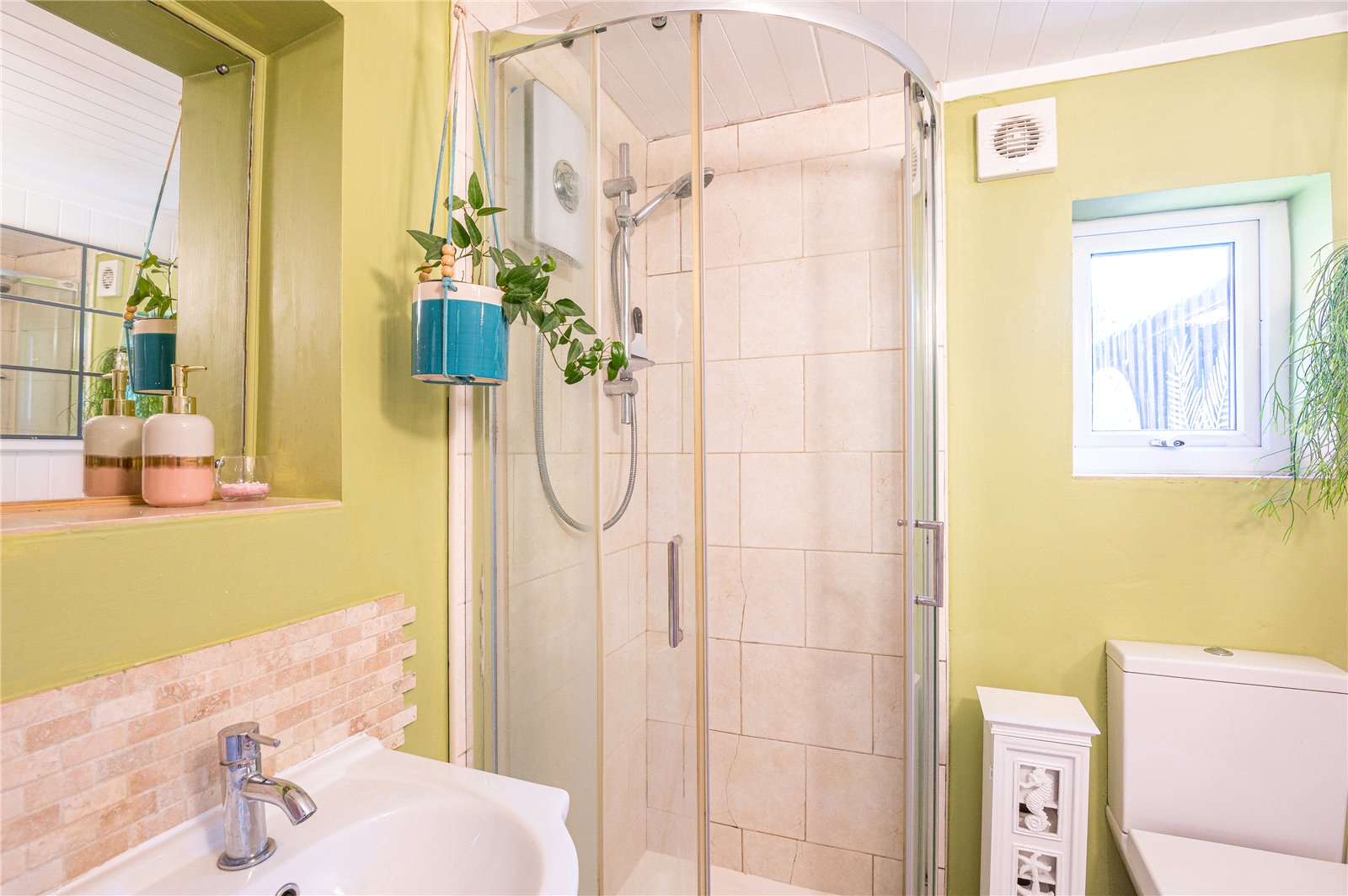 uPVC double glazed window to rear. Fitted with a three piece suite comprising offset quadrant corner shower enclosure housing electric shower, gloss fronted vanity wash hand basin with mixer tap and dual flush close coupled WC. Hand painted exposed timber to one wall with feature lead light mirror to remain. Extractor fan. Hand paint timber ceiling. Drop light switch.