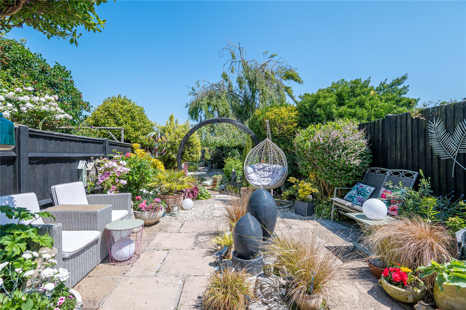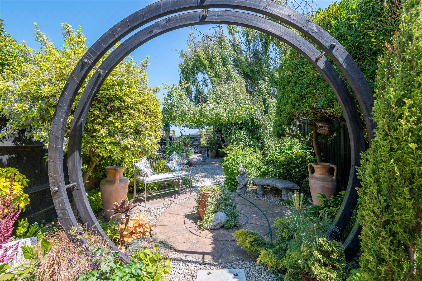 The extensively planted and beautifully landscaped rear garden commences from the Family Room/Sun Lounge with a large stone paved patio terrace ideal for dining 'al-fresco'. External carriage lantern. External water supply and feature stone and shingled beds. A bespoke " Moon Gate " circular timber & steel archway leads through onto a central garden with further circular patio terrace in shingled surround with planted boarders. The garden is fenced to both sides and rear boundary. Gated rear access to the property. Covered timber log store. A footpath continues to the extent of the garden to a further circular sun terrace with access to: