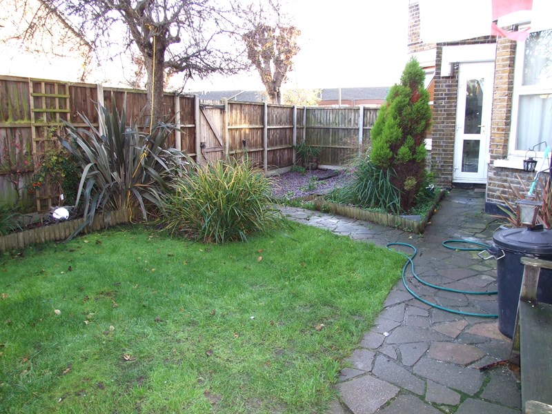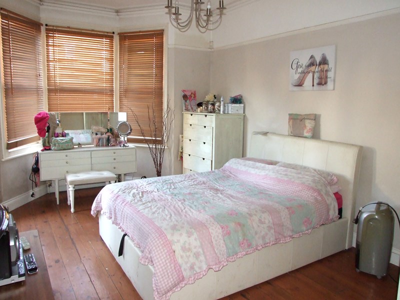 Bedroom one 16'6 x 10'3 (5.03m x 3.12m) uPVC double glazed bay window to side, further uPVC double glazed french doors open onto the garden, double banked radiator, high level lipped skirting, strip wooden flooring, picture rail, coving to smooth plaster ceiling with ceiling rose.
