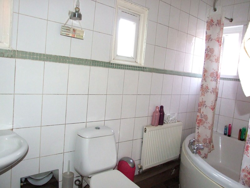 Bathroom uPVC double glazed windows to rear and side elevation. White three piece suite comprising corner panel enclosed bath with mixer taps and independent shower above, close coupled w.c., pedestal wash hand basin, tiling to walls, tiled flooring, ladder style radiator/towel rail.