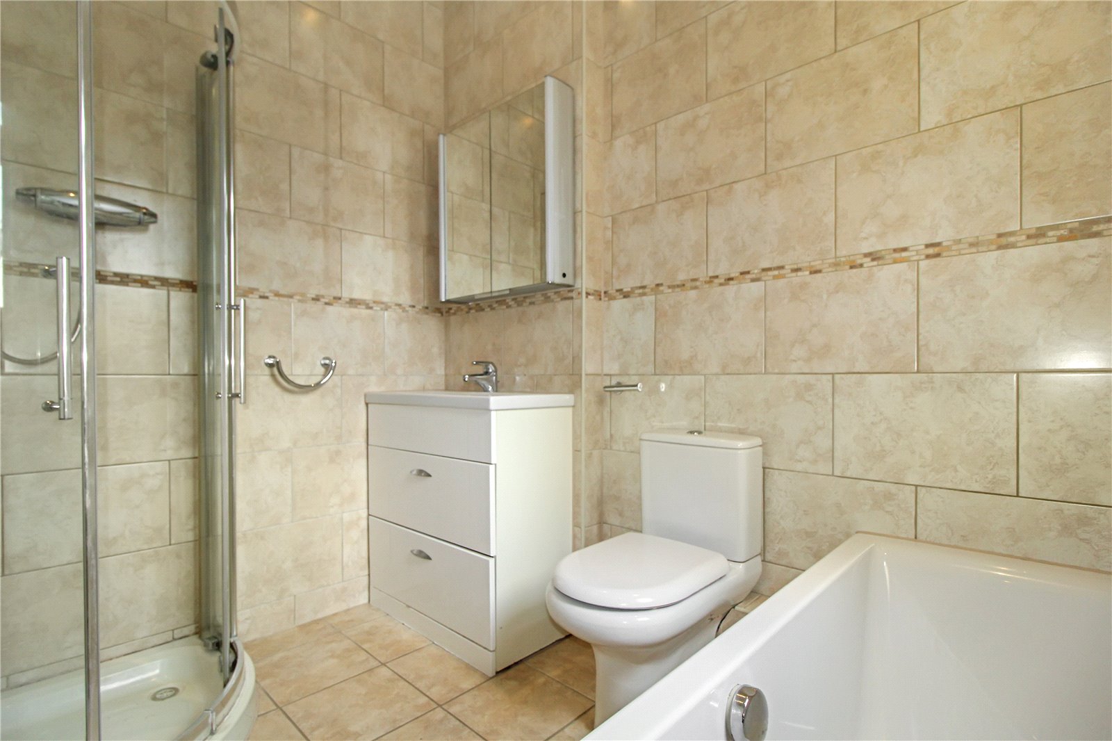 uPVC double glazed obscure window to rear. Fully tiled and fitted with a four-piece contemporary white suite comprising panel enclosed bath with chrome monobloc mixer tap, corner shower cubicle with wall-mounted chrome shower attachment, enamel wash basin with chrome monobloc mixer tap set upon vanity unit with cupboards below, wall-mounted vanity mirror above and low-level w.c. Matching tiled floor. Wall-mounted heated towel rail. Wall extractor fan. Smooth plastered ceiling with recessed spotlights.