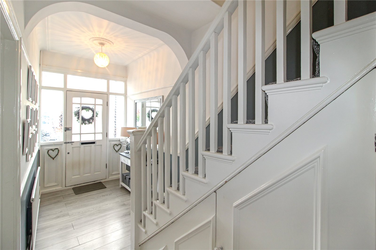 Entry through obscure glazed door with obscure double glazed windows adjacent. Wood-effect laminate flooring. High-lipped skirting. Radiator. Chrome light switches. Thermostat control. Smooth plastered walls. Smoke alarm. Coving to smooth plastered ceiling. Centre ceiling light. Doors with obscure glazed inserts into Living Room and Family Room with doors to understairs storage cupboard housing shelving and space for under the counter appliance with further understairs storage cupboard housing electric consumer unit, electric meter and gas meter. Carpet to stairs leading to first floor landing.