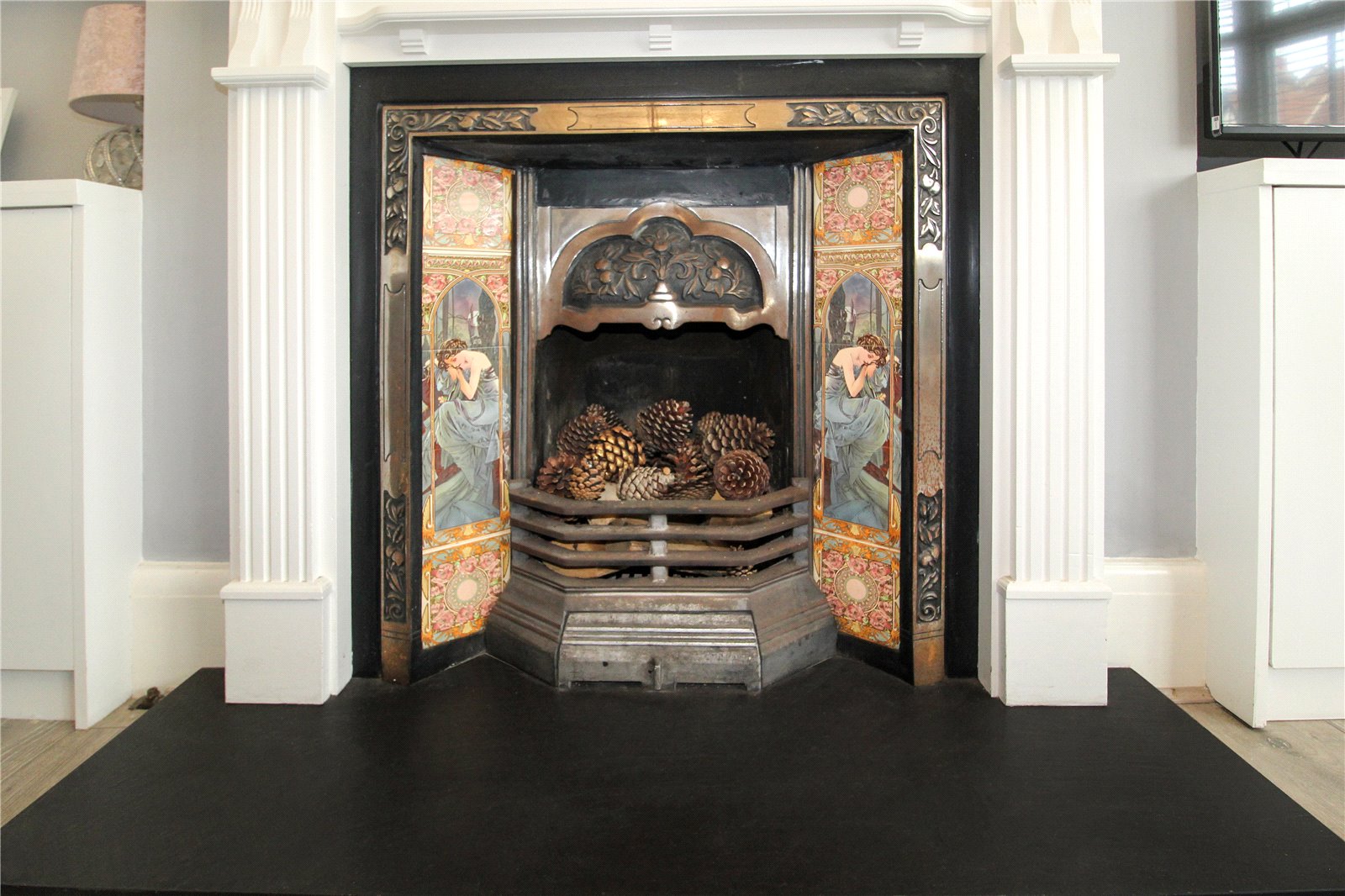 uPVC double glazed bay windows to front with decorative glazed inserts. Feature cast-iron fireplace with beautiful tiled inserts, stone hearth and decorative wooden surround with fitted base-level storage cupboards in adjacent alcoves with shelving above. Wood-effect laminate flooring. High-lipped skirting. Radiator. Smooth plastered walls. Coving to smooth plastered ceiling. Decorative centre ceiling rose and ceiling light.