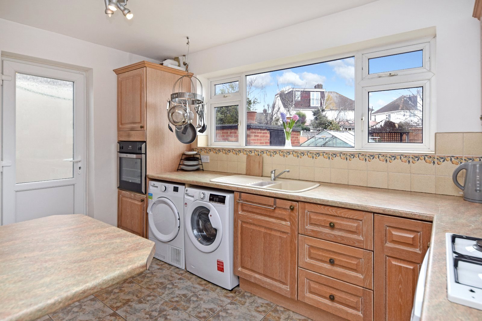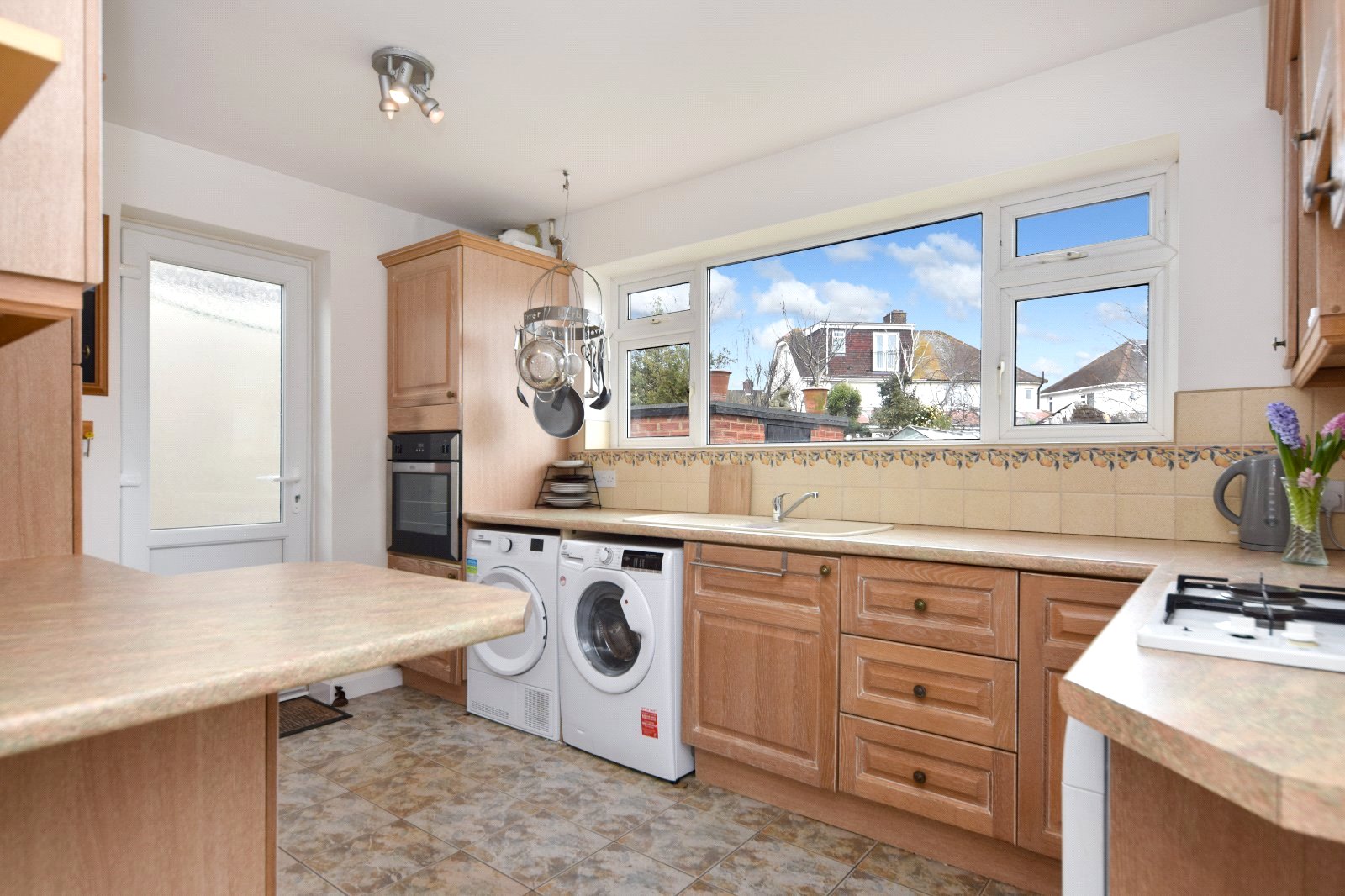 Large uPVC double glazed window to rear overlooking garden. Obscure uPVC double glazed window to sideway access. The Kitchen is fitted with a comprehensive range of eye and base level units with rolled edge working surfaces over inset with single drainer 'one-and-a-quarter' sink unit with mixer tap over. Built in 'Belling' electric oven with split level 'Neff' four ring gas hob with concealed extractor over. Integrated upright fridge/freezer. Under counter appliances (to remain); 'Hoover' washing machine, 'Beko' tumble drier and 'Siemens' dishwasher. Tiled splashback. Radiator. Smooth plastered ceiling.