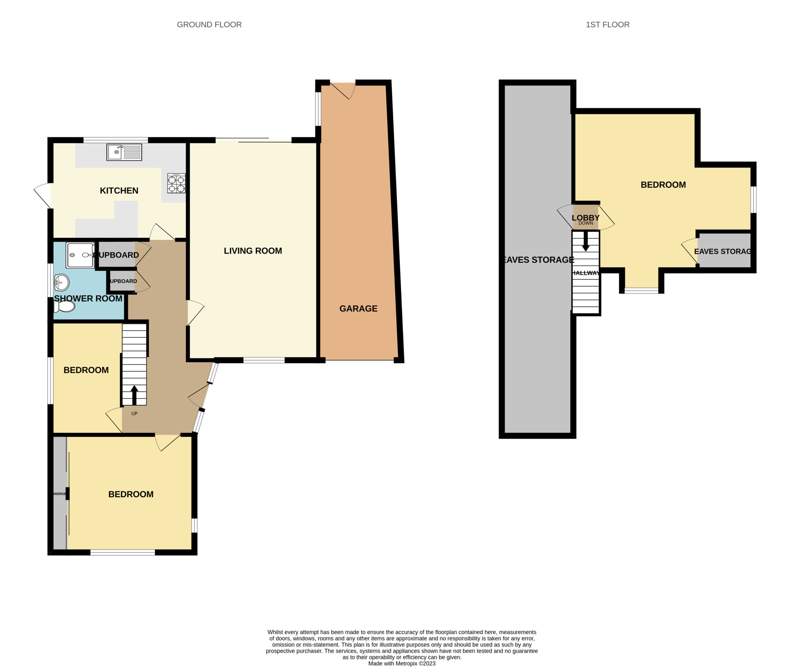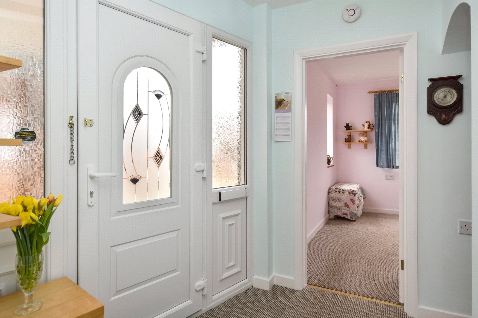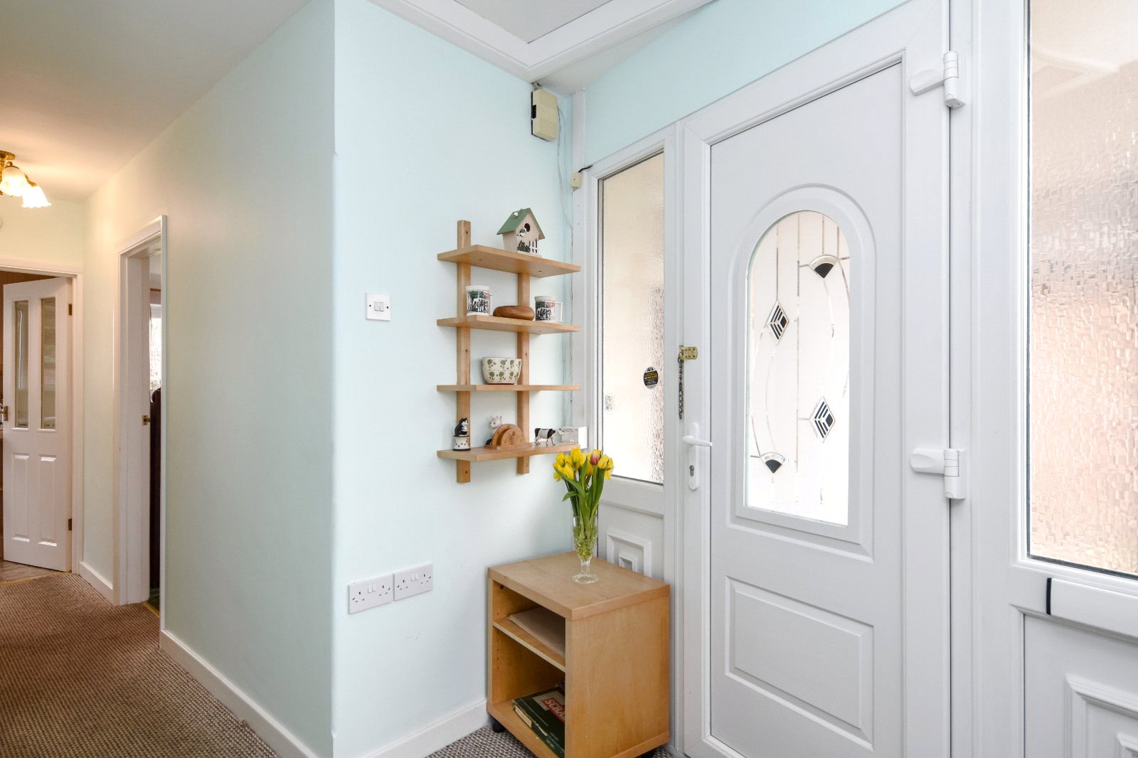 Panelled doors to Bedrooms and Bathroom. Part glazed doors to Kitchen and Living Room. Wall light point. Staircase providing access to the first floor Bedroom. Pair of doors to separate storage cupboards with ample storage space. Thermostat control panel. Radiator. Smooth plastered ceiling.