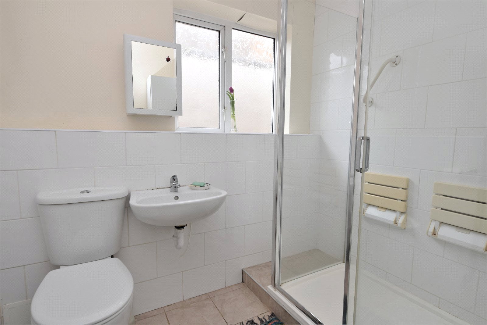 Obscure uPVC double glazed window to side aspect. The white three piece suite comprises suspended wash hand basin with mixer tap over, dual flush wc and double width shower enclosure with integrated shower unit. Partly tiled walls. Ceramic tiled flooring. Ladder style heated towel rail. Radiator. Smooth plastered ceiling.