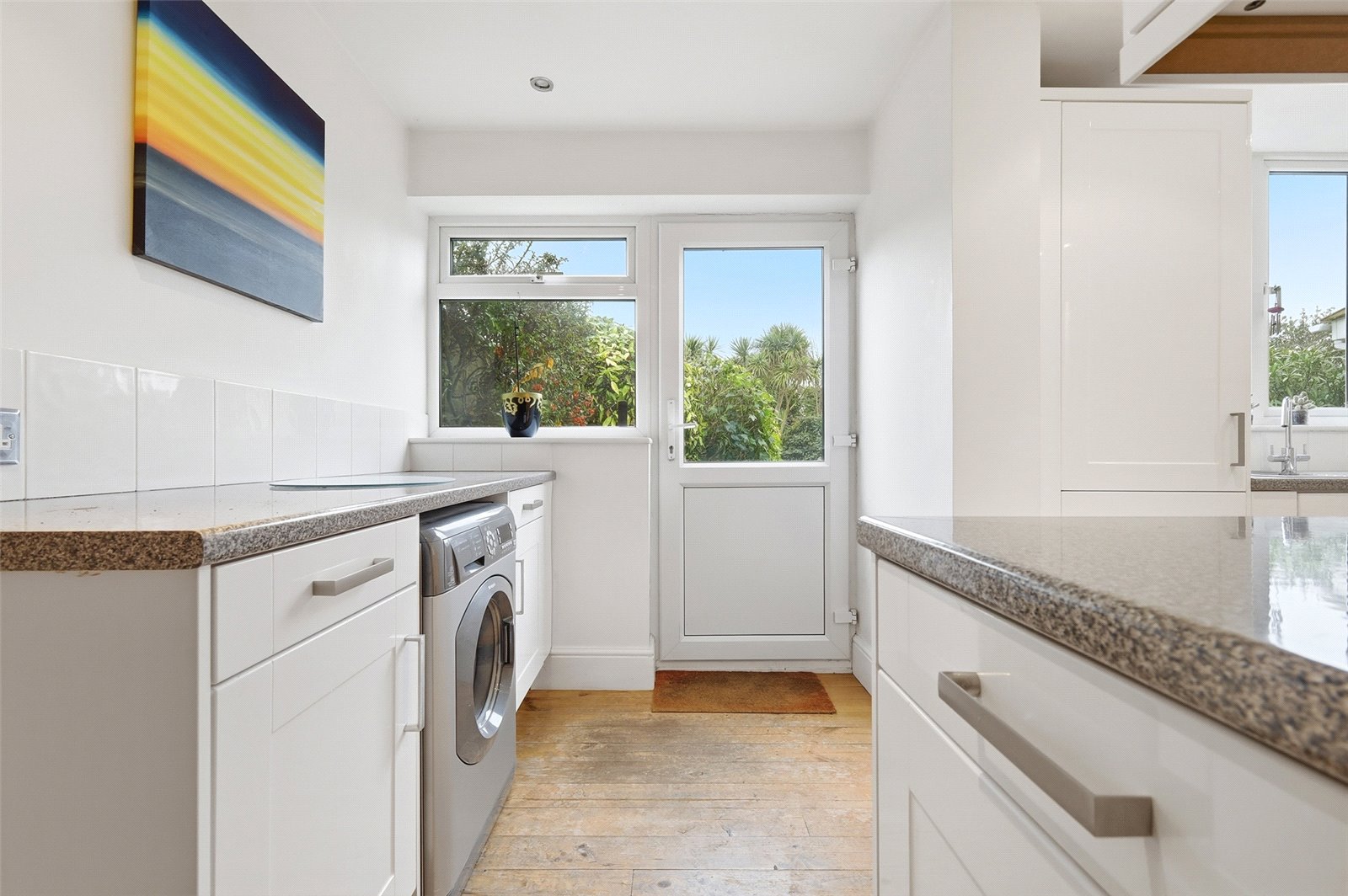 UPVC door with inset glazed panel leading to rear garden. Two UPVC double glazed windows to rear overlooking rear garden. Kitchen is fitted with a modern range of base and eye level high gloss Shaker style cabinets incorporating a rolled edge working surface, inset stainless steel sink with mixer tap and drainer unit. Inset four burner gas hob with canopied extractor hood above. Integrated electric fan assist oven. Space and plumbing for washing machine. Cupboard housing Vailant combination gas fired boiler. Tiled splashbacks. Fitted wine rack. Wall mounted radiator. Exposed wooden floorboards. High level skirting. Smooth plastered ceiling with recessed LED lighting. Door to front provides access to the garage.