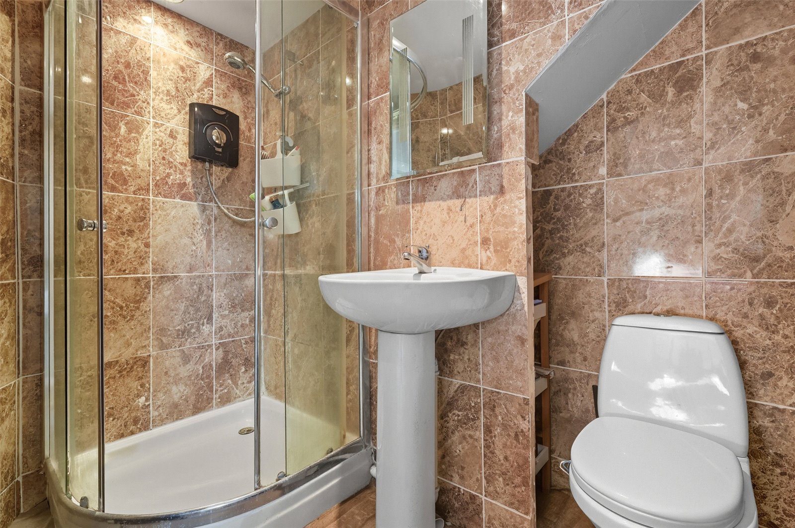 Fitted with a three piece suite comprising low flush WC, pedestal wash basin with mixer tap and enclosed shower cubicle with wall mounted electric showerhead, adjustable showerhead and glass shower screen. Tiled effect vinyl flooring. Tiled walls. Smooth plastered ceiling with recessed LED lighting. Ceiling mounted extractor fan. Wall mounted medicine cupboard.
