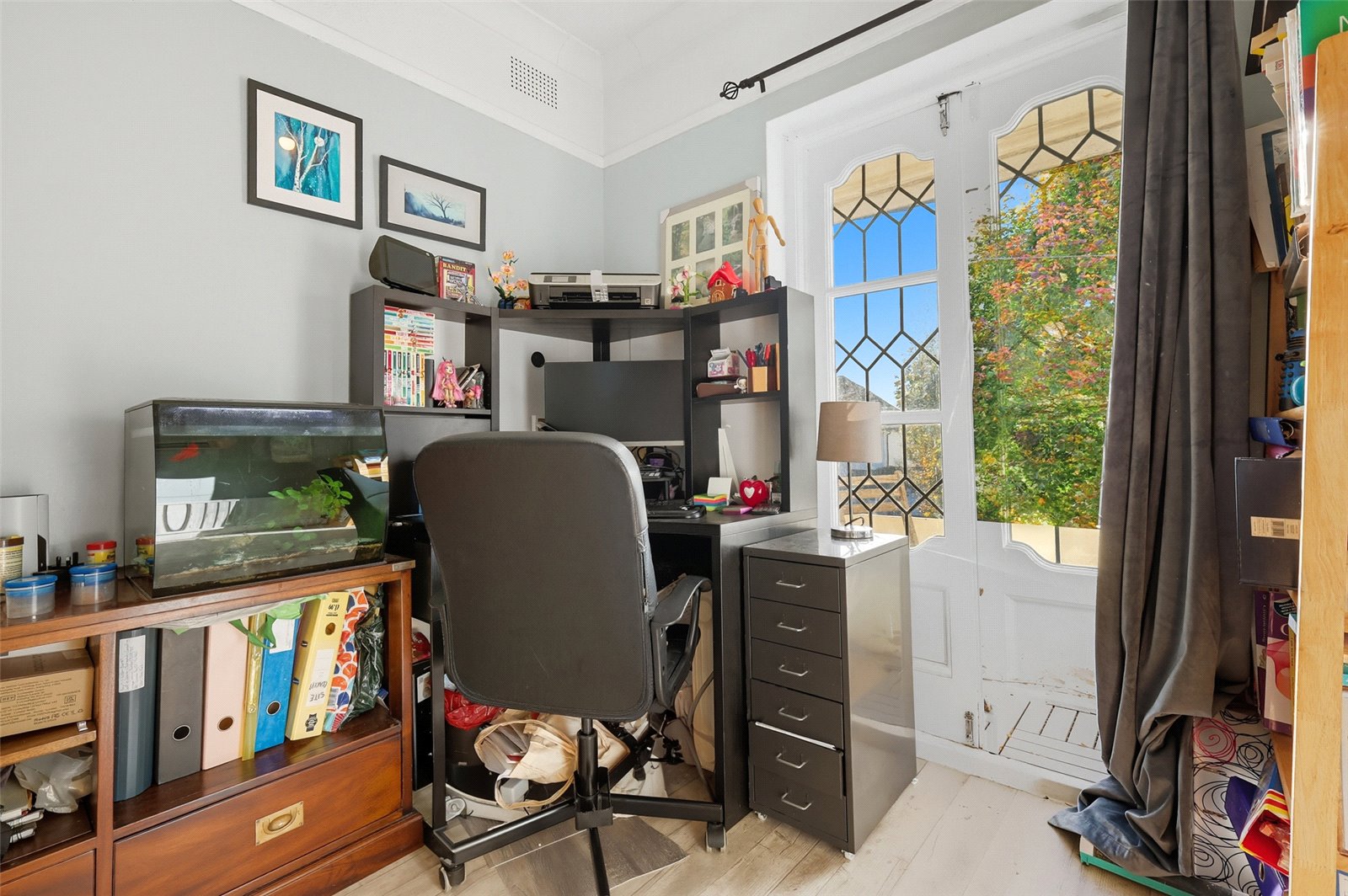Double wooden doors to front with inset leaded light panels leading to front balcony. Wall mounted radiator. Wood effect vinyl flooring. High level skirting. Feature picture rail. Coved cornice to ceiling.
