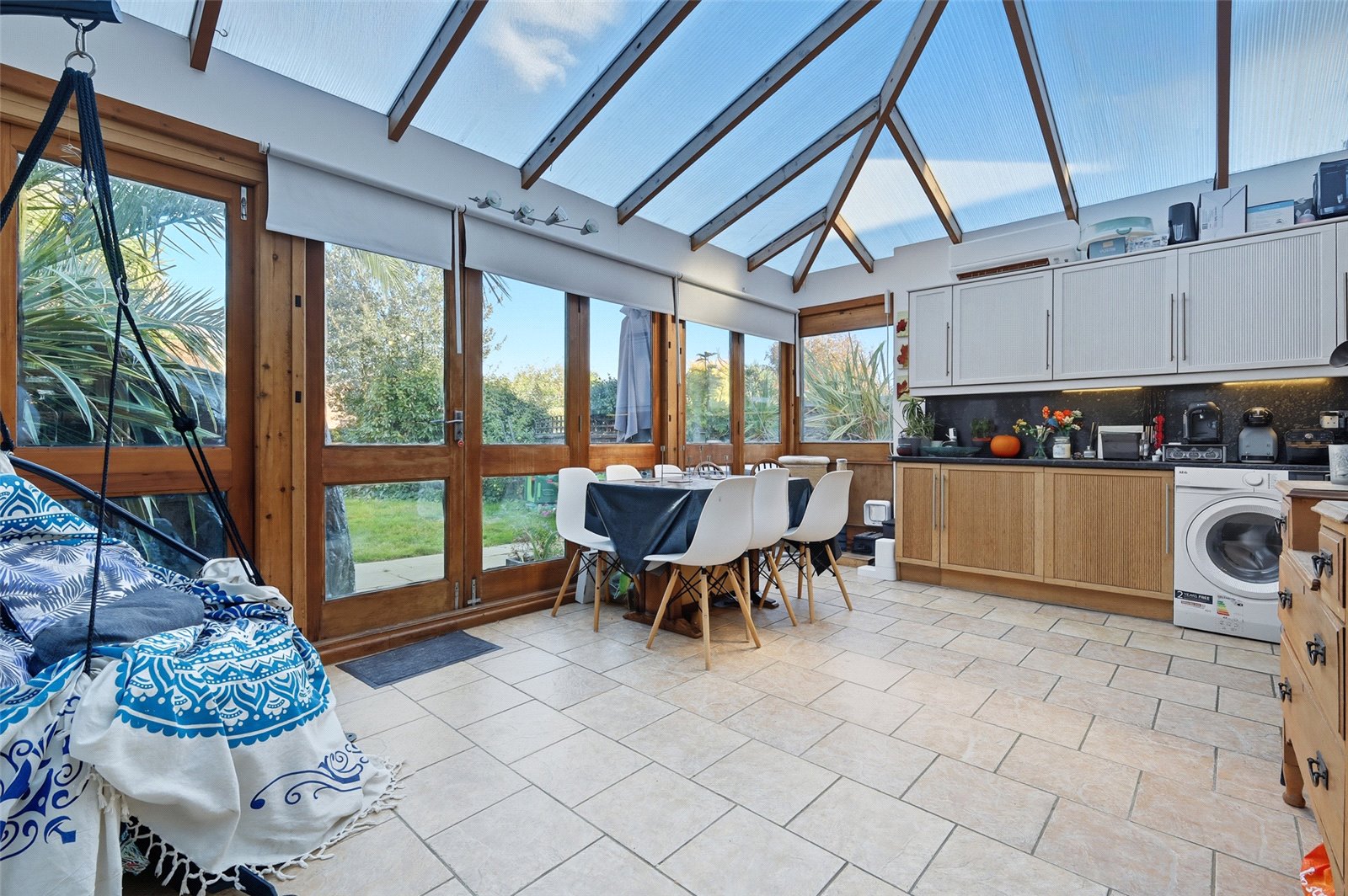 overall size. Wooden framed double glazed bi folding doors to rear leading on to rear garden. Part vaulted transparent ceiling. Kitchen is fitted with a range of base and eye level wooden fronted cabinets incorporating a rolled edge working surface. Inset stainless steel sink with mixer tap and drainer unit. Inset four burner induction hob with canopied extractor hood above. Integrated electric fan assisted oven. Integrated dishwasher. Space for free standing American style fridge/freezer. Space and plumbing for washing machine. Tiled splashbacks. Tiled flooring throughout. Two high level designer radiators. High level skirting. Smooth plastered ceilings. Wall mounted air conditioning unit. Glazed inner door to entrance hall.