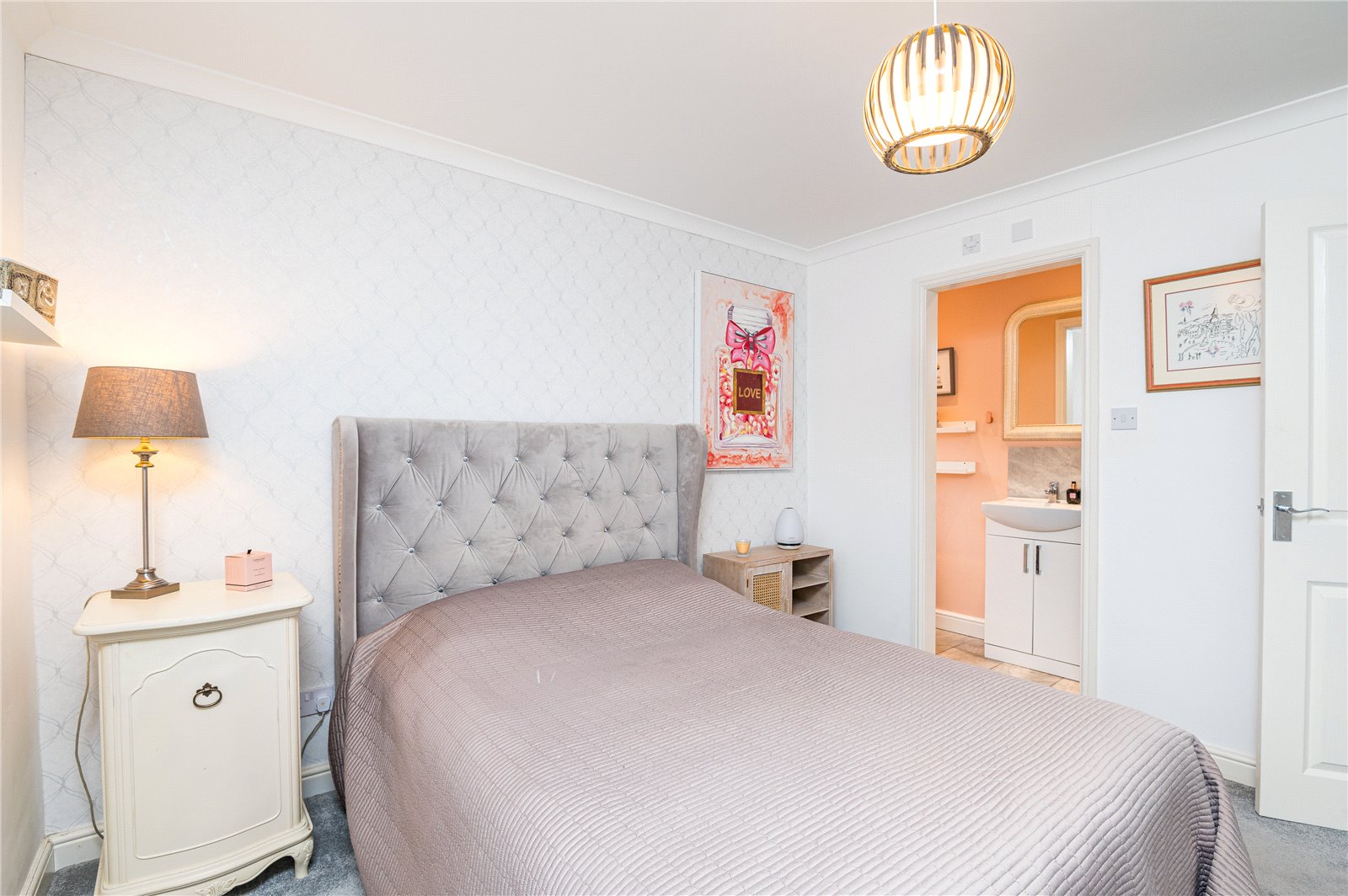 This lovely principal double bedroom suite has a double glazed window overlooking the rear garden. Radiator. Coved ceiling. Opening to: