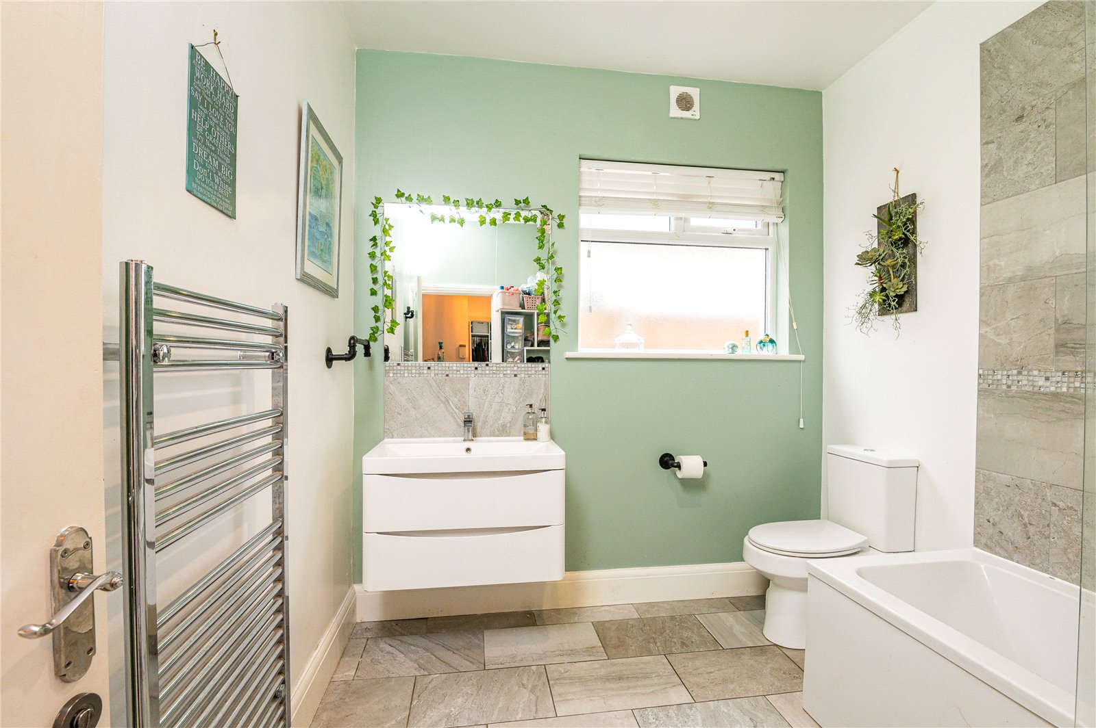Fitted with a modern white suite comprising panelled shower bath with mixer tap, separately plumbed shower over and fitted shower screen. Vanity unit with wash basin and mixer tap, storage drawers below. Low flush WC. Part tiled walls. Tiled floor. Chrome heated towel rail. Double glazed window to side.