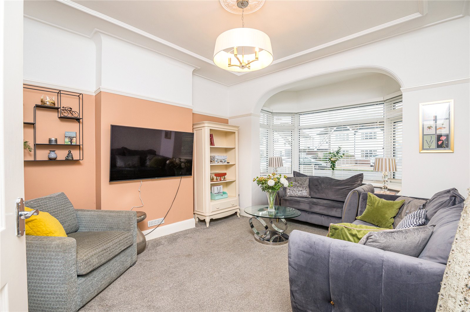 into wide double glazed bay window to front. Two radiators. Picture rail. Plaster ceiling mouldings and ceiling rose.