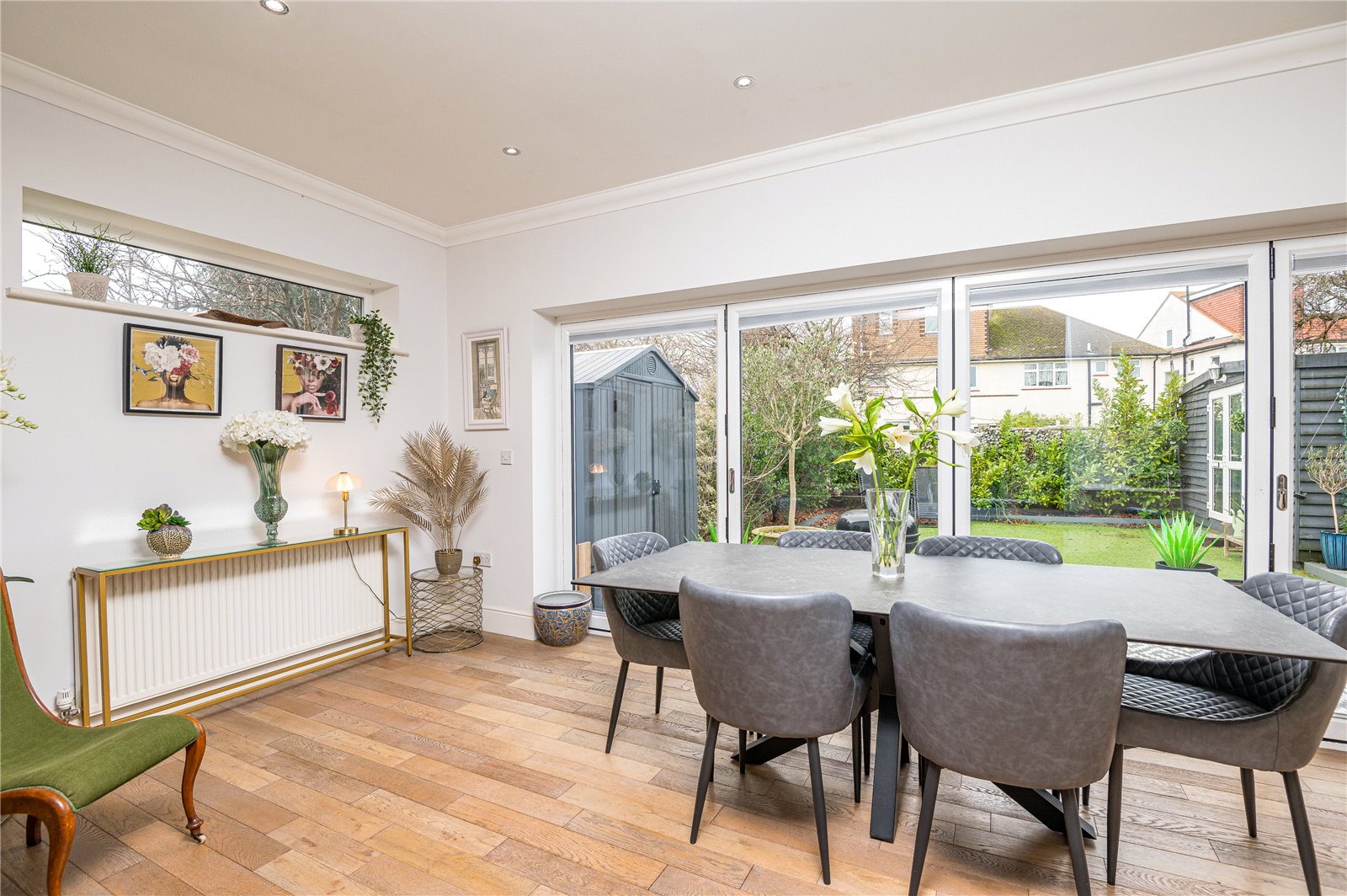 Overall size. This wonderful "L" shape open-plan living space has almost full width double glazed bi-fold doors, with fitted blinds, leading directly to the rear garden. Two double glazed high level windows to either side. Solid oak wood floor. Contemporary wall mounted gas fire with timber mantle. Two radiators. . Coved ceiling with recessed lighting. Wide opening to: