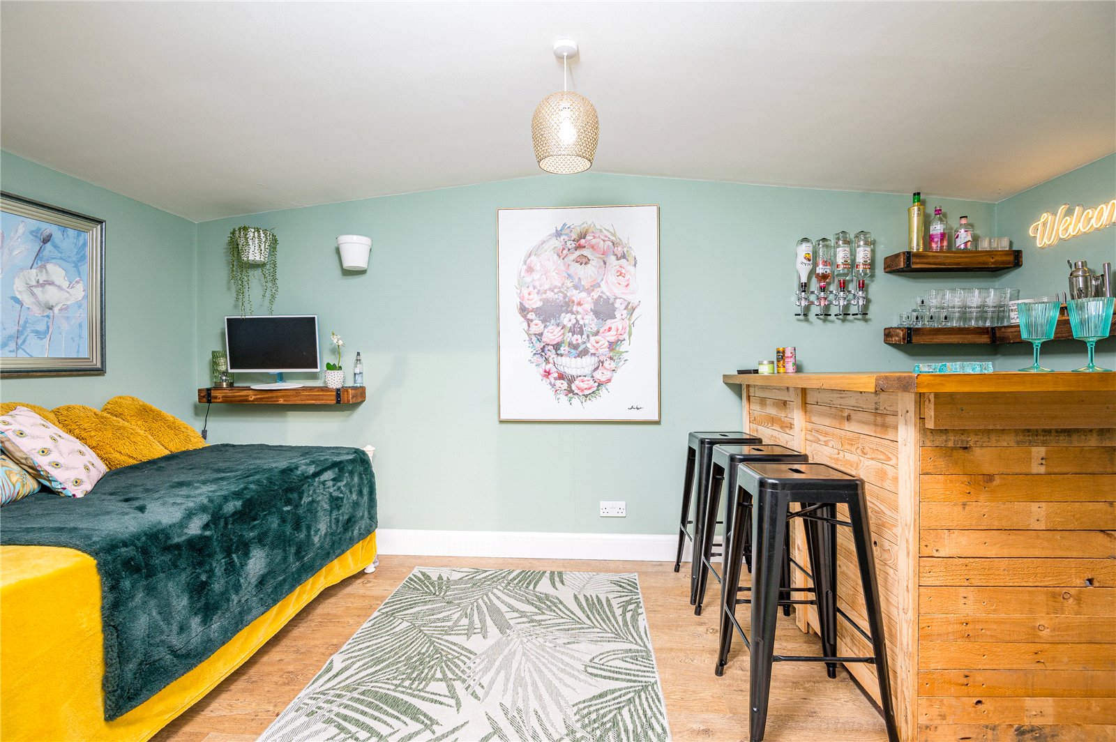 A superb detached garden room with UPVC double glazed French double doors. Light and power connected. Built in bar. This modern and contemporary space would make an ideal home office/business.
