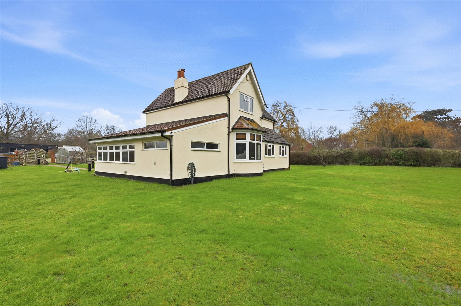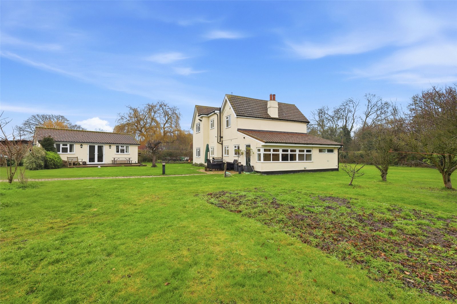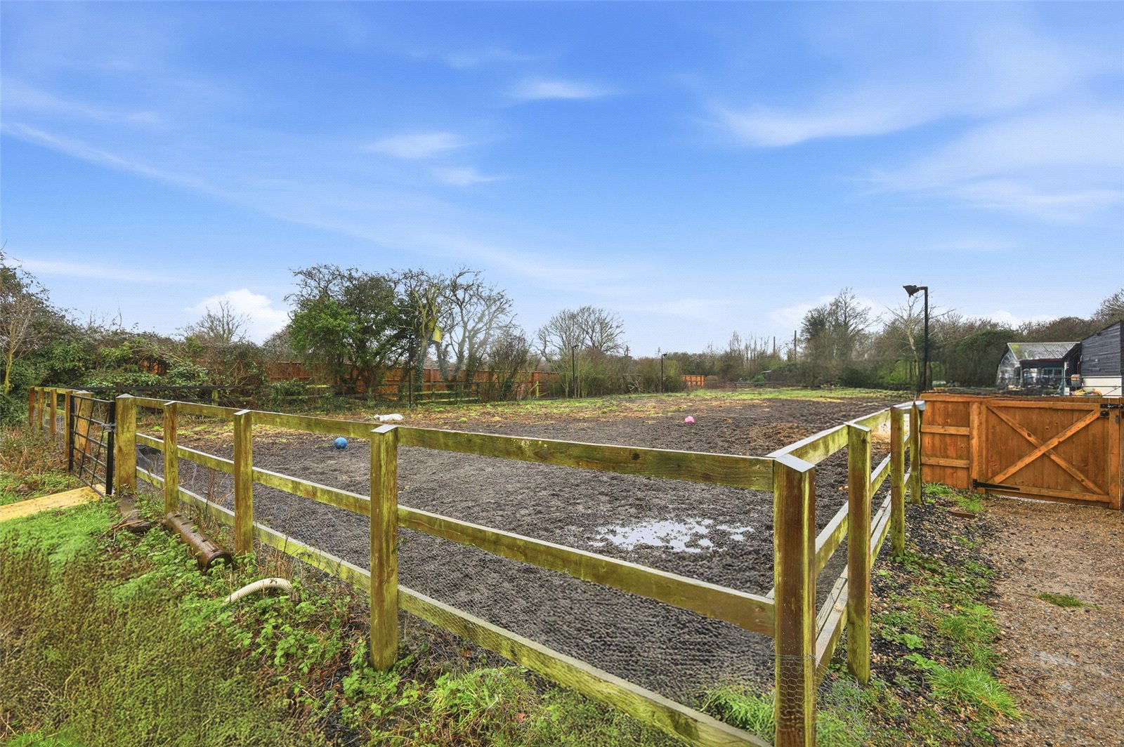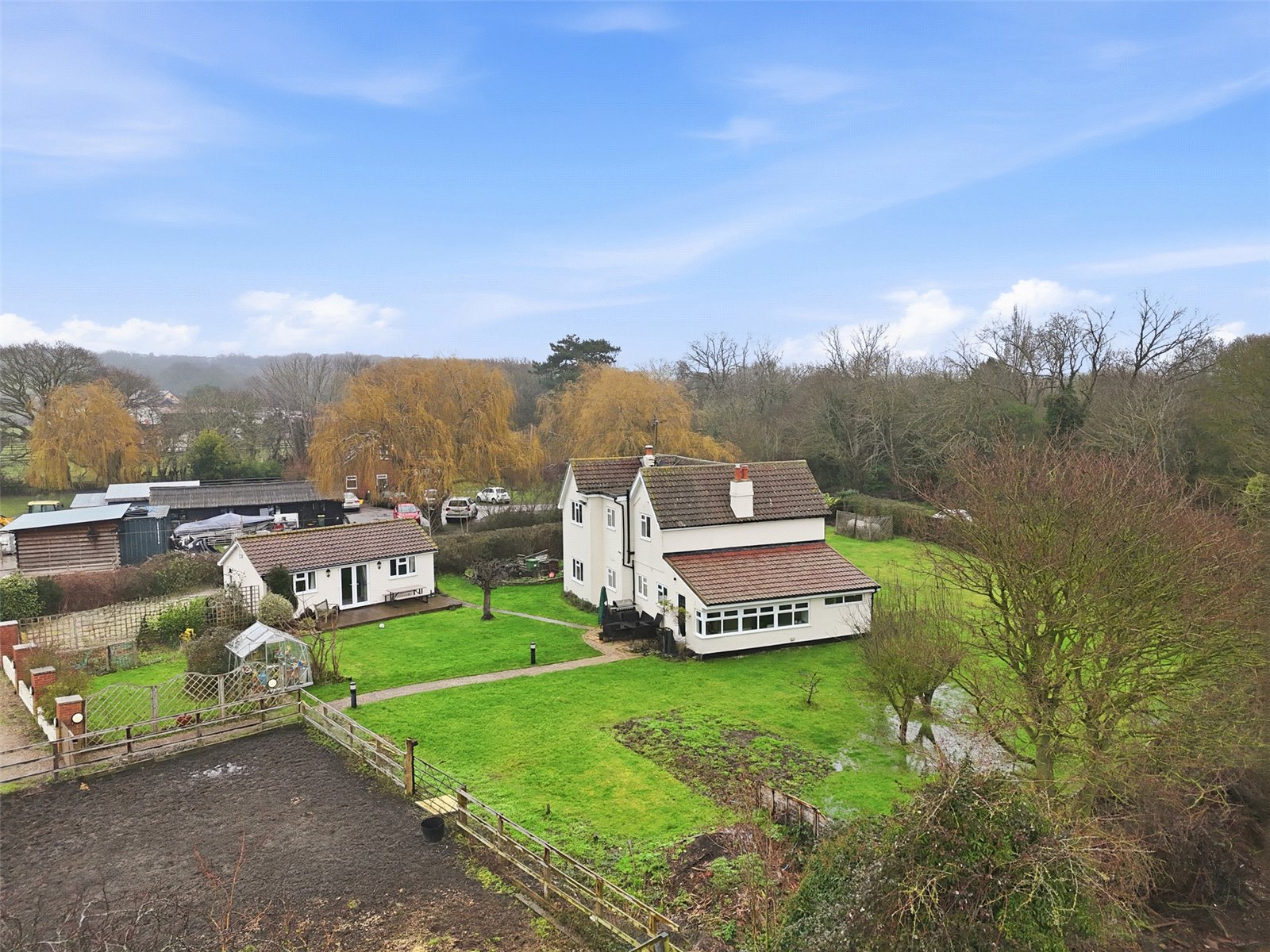The landscaped gardens commences from the Lounge with French doors and from stable door from the Farmhouse Kitchen. Block paviour circular patio terrace ideal for dining al fresco. The remainder of the gardens are laid to a vast expanse of lawned area. Independent driveway to the side of the plot provides off street parking facilities for numerous vehicles and leads to the array of outbuildings, menage and stables.