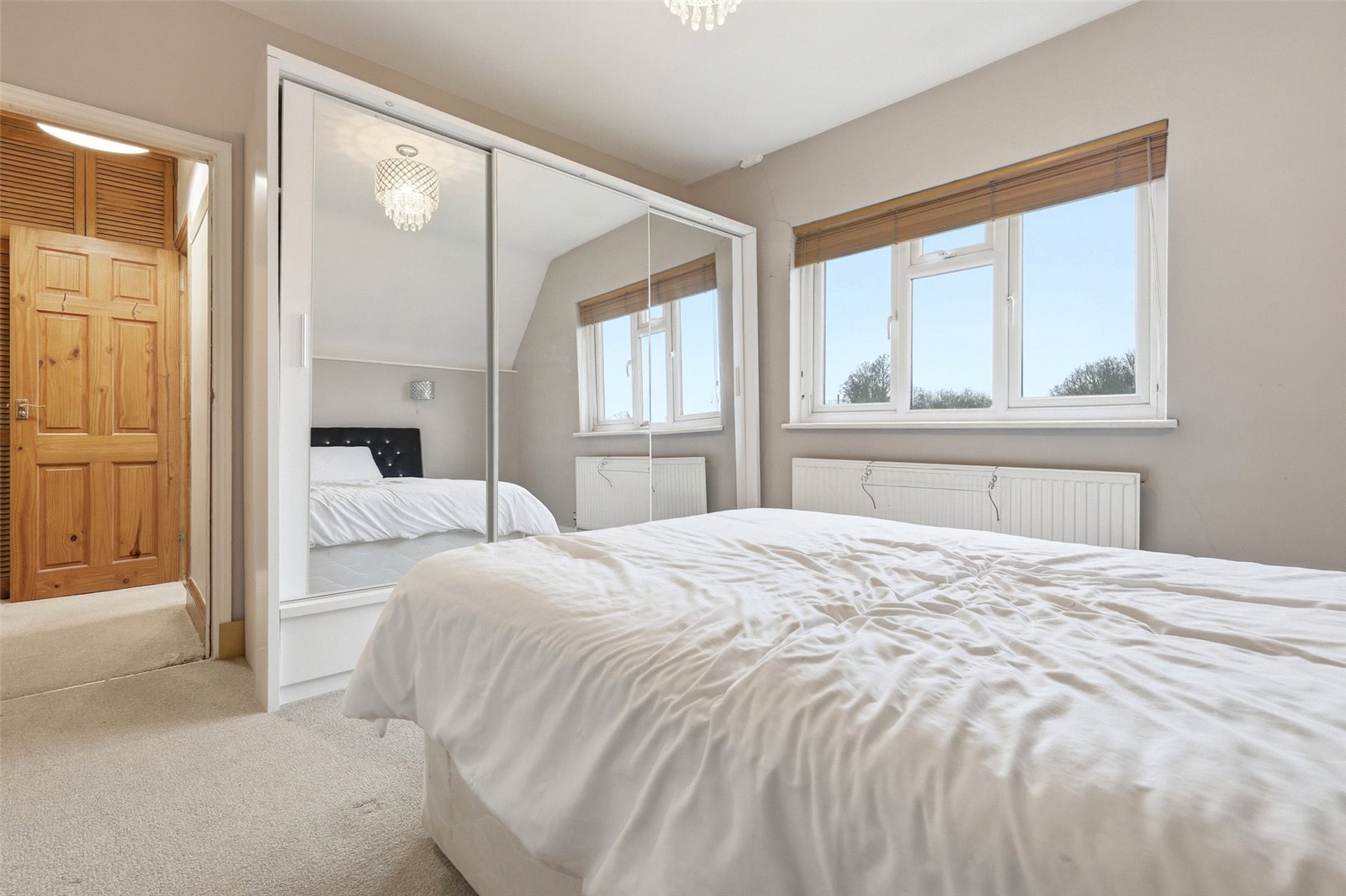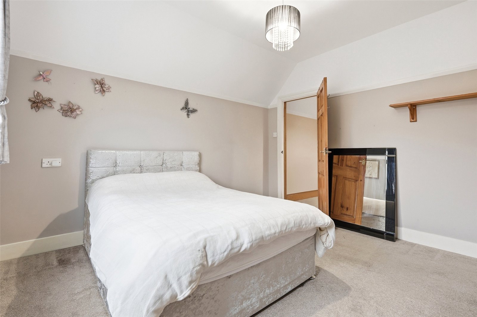 Smooth plastered walls and ceiling. Picture rail. Loft access hatch. Two storage cupboards. Six panelled doors leading to rooms.