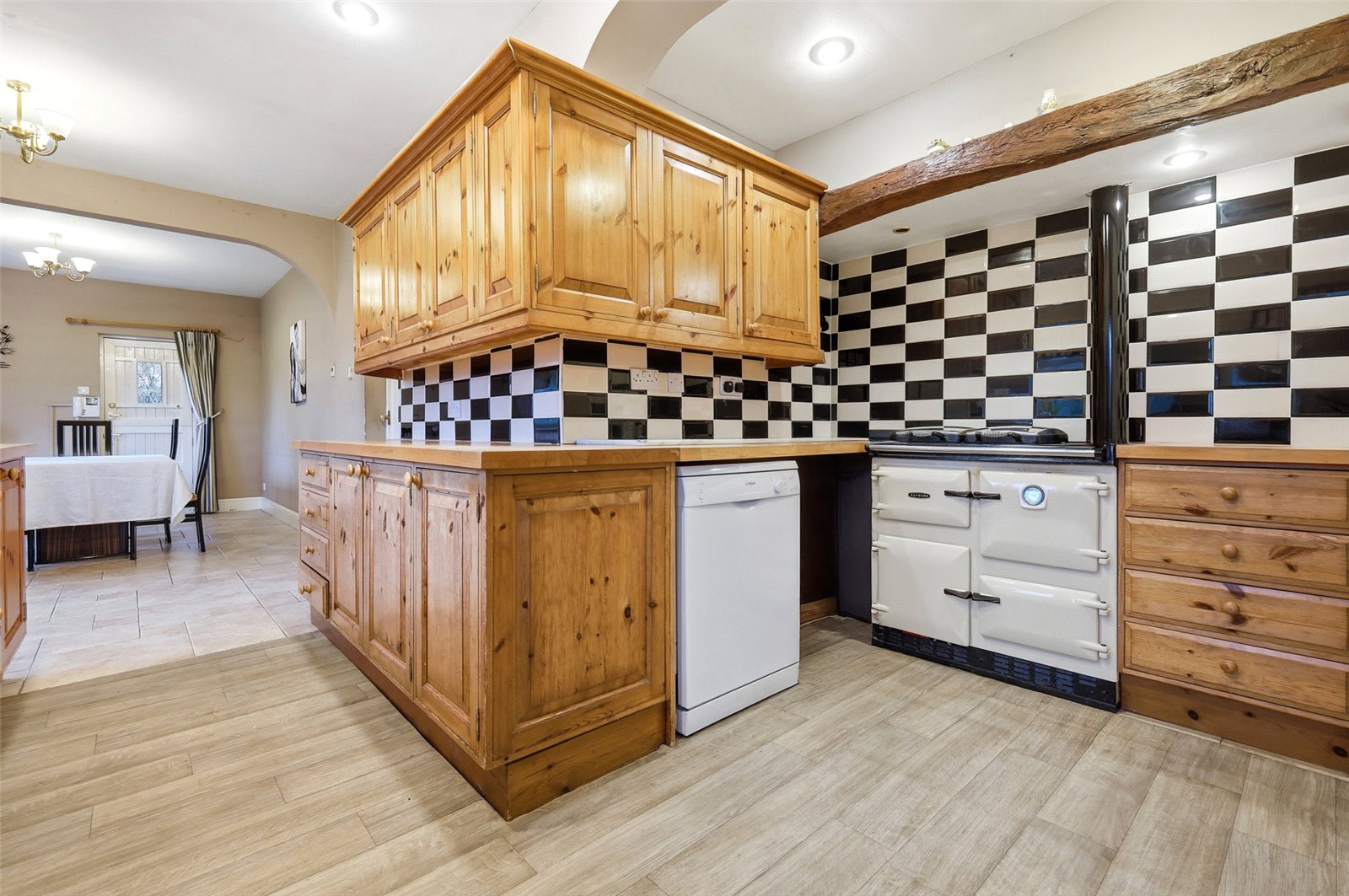 UPVC double glazed windows to the rear aspect. Stable door to the side aspect. The kitchen is fitted with a range base units with matching wood work surface incorporating a stainless steel single drainer sink with mixer tap. Further matching wall mounted storage units. Aga oven to remain and space for fridge/freezer. Space and plumbing for dishwasher. Part tiling to walls.