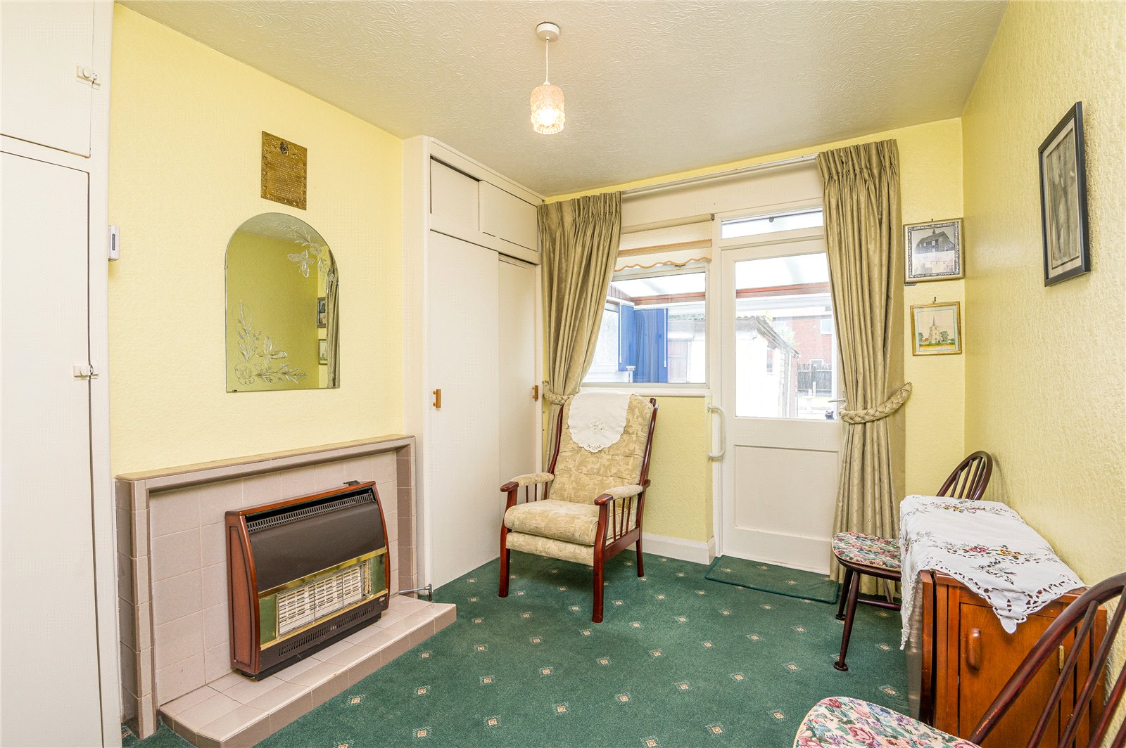 Double glazed door to rear with window adjacent leading into the Conservatory. Tiled fire surround with inset gas fire. Two built-in cupboards.