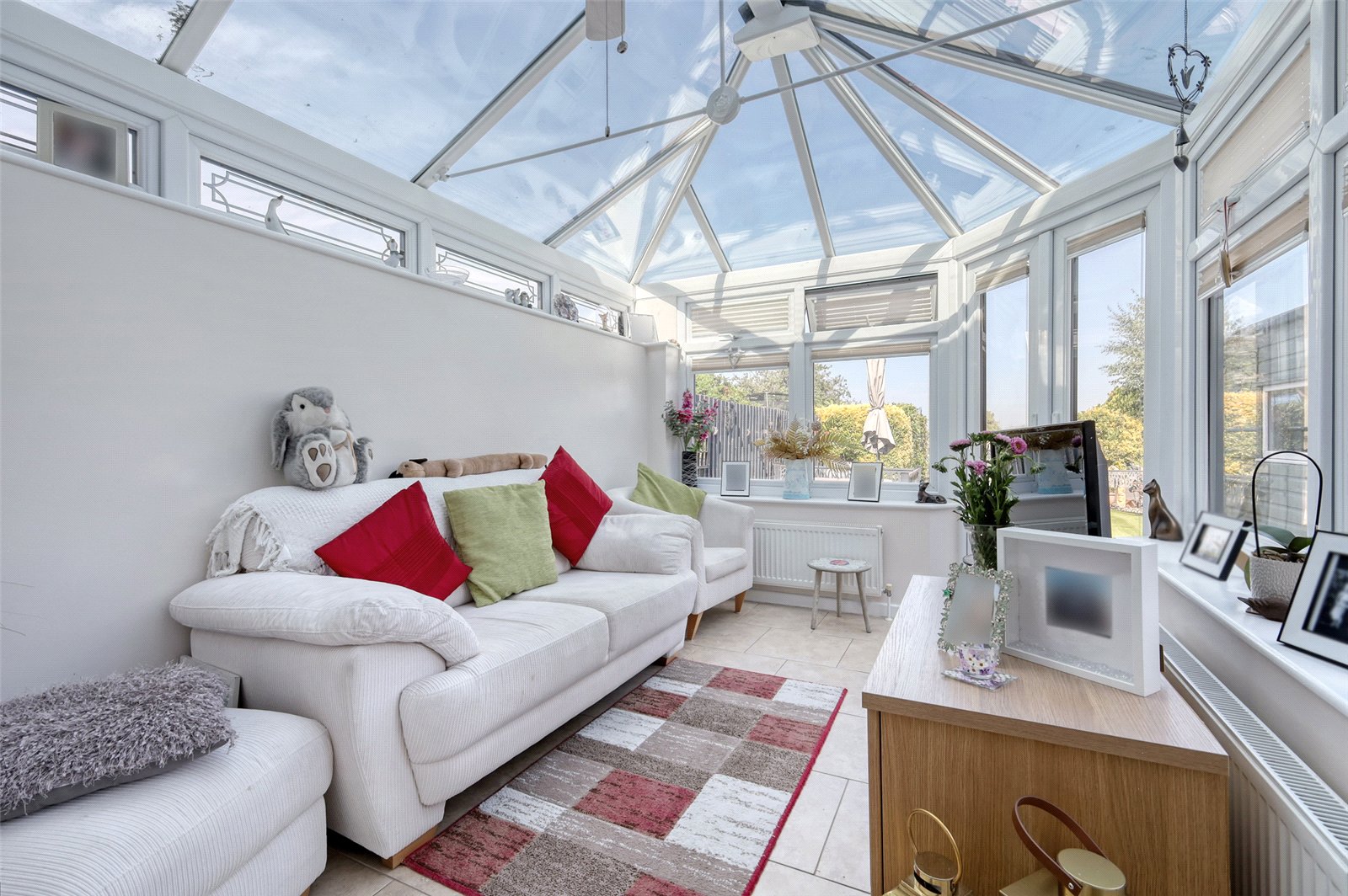 Of solid construction to low level with porcelain tiled floor. Radiator. French doors give access to the landscaped rear garden, and double glazed windows to side and rear with opening fanlights. Bespoke fitted sun blinds. Double glazed self cleaning vaulted roof. Power points. Radiator.