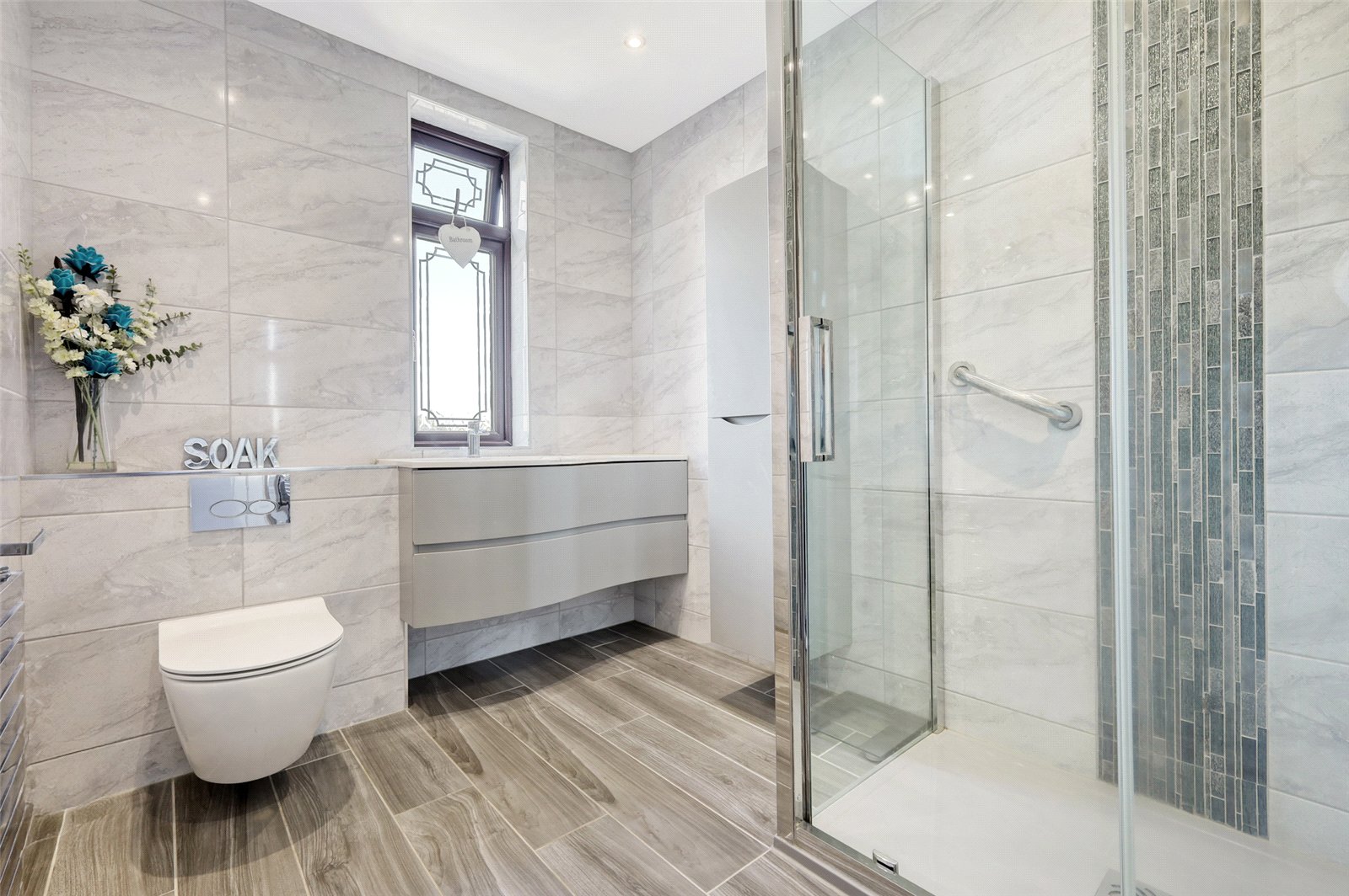 Obscure uPVC double glazed leadlight window to rear. Fitted with a three piece suite comprising walk in wet room style shower enclosure with handheld and rainwater drench fittings and feature vertical mosaic tiling, integrated cistern dual flush WC, and double width vanity washbasin with designer mixer tap and large storage drawers. Matching bathroom furniture. Full height heated towel rail. Contemporary radiator. Full tiling with timber effect porcelain tiled floor and polished porcelain tiled walls with further vertical metallic mosaic tiled border. Smooth plastered ceiling. Recessed LED lighting.