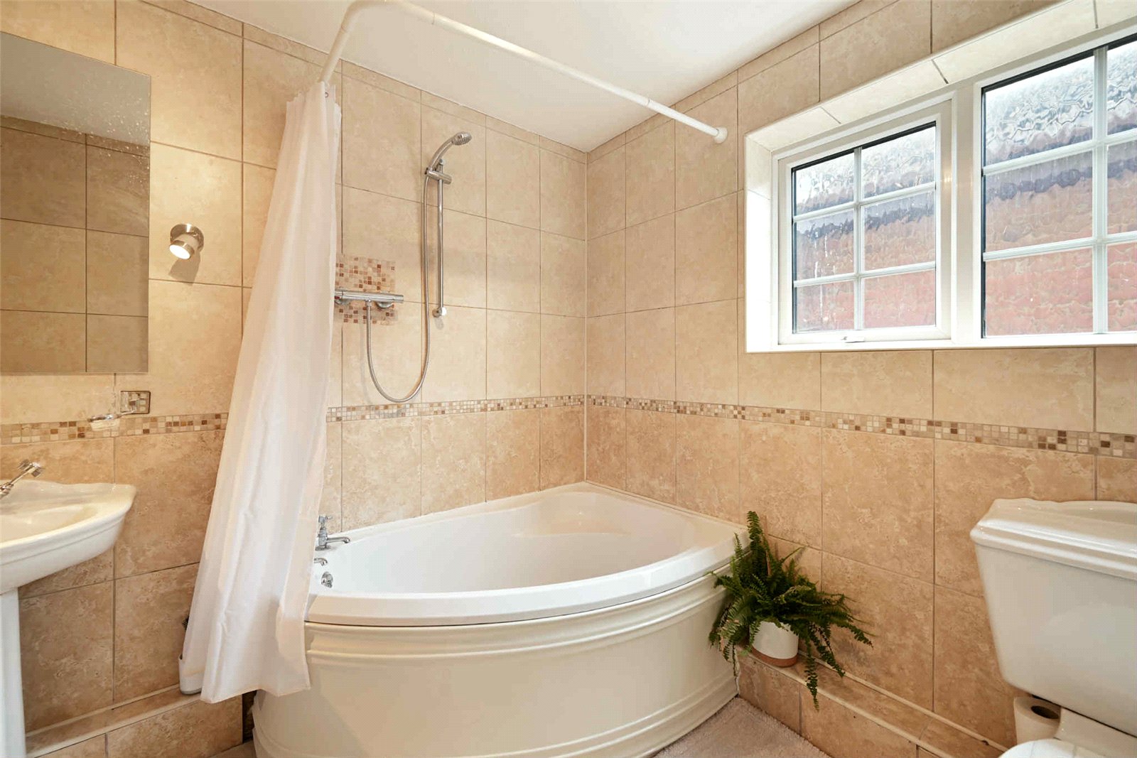 An unusually well proportioned room with obscure uPVC double glazed multi pane window to side. Fitted with a three piece suite comprising of corner bath with independent shower above, pedestal wash basin and close coupled WC. Travertine effect porcelain ceramic tiling to walls with feature mosaic border tiles. Radiator. Drop light switch.