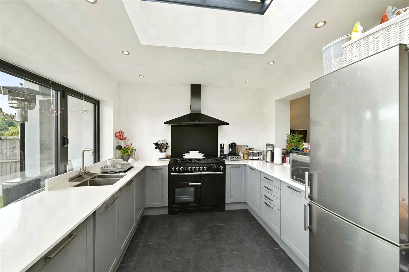 An exceptionally well appointed contemporary rear addition with full width powder coated aluminium bi-folding doors that lead onto a rear Sun Loggia, with recessed external lighting above and a large central lanterned skylight window to the centre of the room. The kitchen has been fitted with a comprehensive range of gloss fronted base and eye level cabinets with white quartz working surfaces and matching upstands with inset stainless steel sink and designer mixer tap. Space and supply for double width Range cooker with black steel splashback and matching extractor hood. Integrated dishwasher, space for upright fridge/freezer. Contemporary vertical radiator, gas combination boiler serving domestic hot water and central heating system. Smooth plastered ceiling with recessed LED lighting.