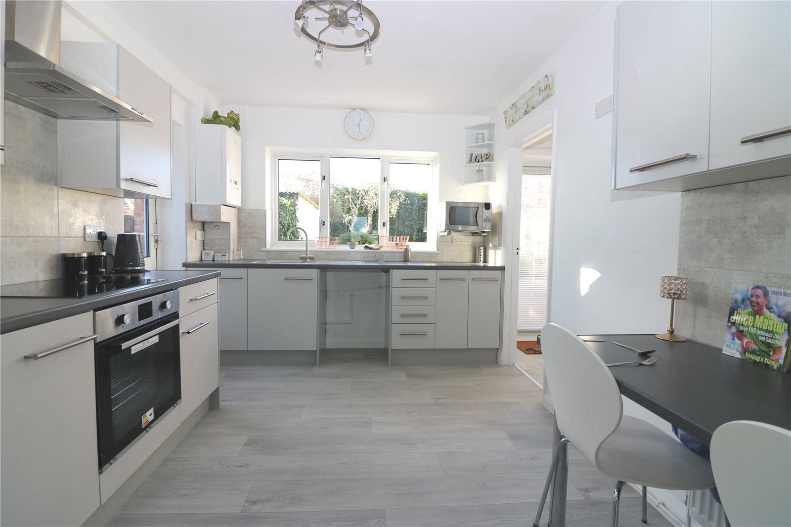 High end soft close kitchen cabinets, quality sanitary goods. Luxury tiling and a mix of carpeting laid on deep underlay and padded Rhino floor modern vinyl. Modern blinds or curtains are provided where needed and low energy light fittings are in every room. Cheerful, light and spacious with a welcome feel this really is a beautiful home.