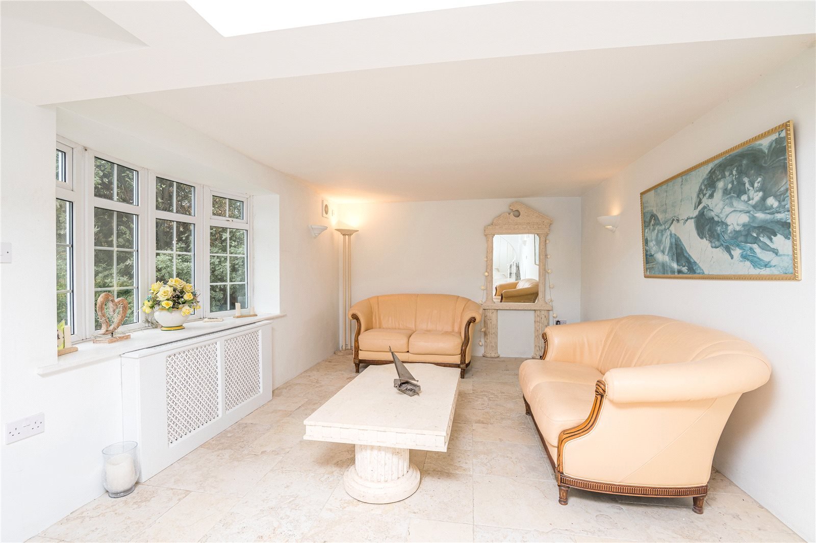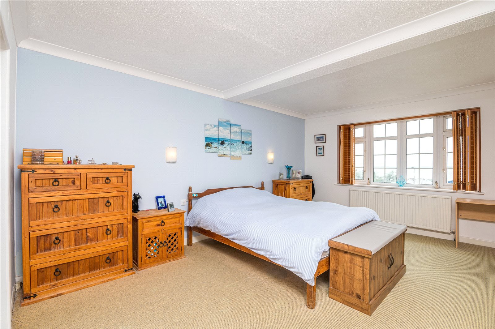 This bright dual aspect room has a double glazed window to rear overlooking the garden and affording wonderful views across the Thames Estuary and Kent Coastline, plus a double glazed door to side leading to the sun terrace. The kitchen is fitted with a wide range of Cream fronted units and extensive work surfaces with inset sink unit with mixer tap. Range of cupboards and drawers below. Built in refrigerator with matching decor panel. Space and plumbing for dishwasher. Inset four ring gas hob with extractor hood above. Built in under oven. Space for freezer. Utility cupboard housing space and plumbing for washing machine. Range of wall mounted storage cabinets. Part tiled walls. Tiled floor. Radiator. Recessed ceiling lighting.