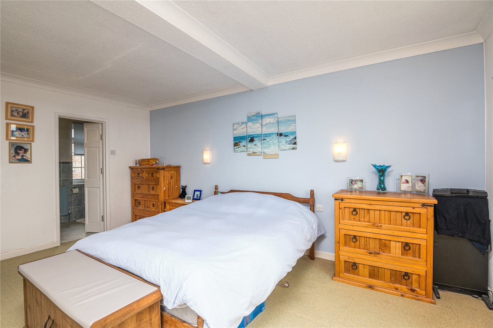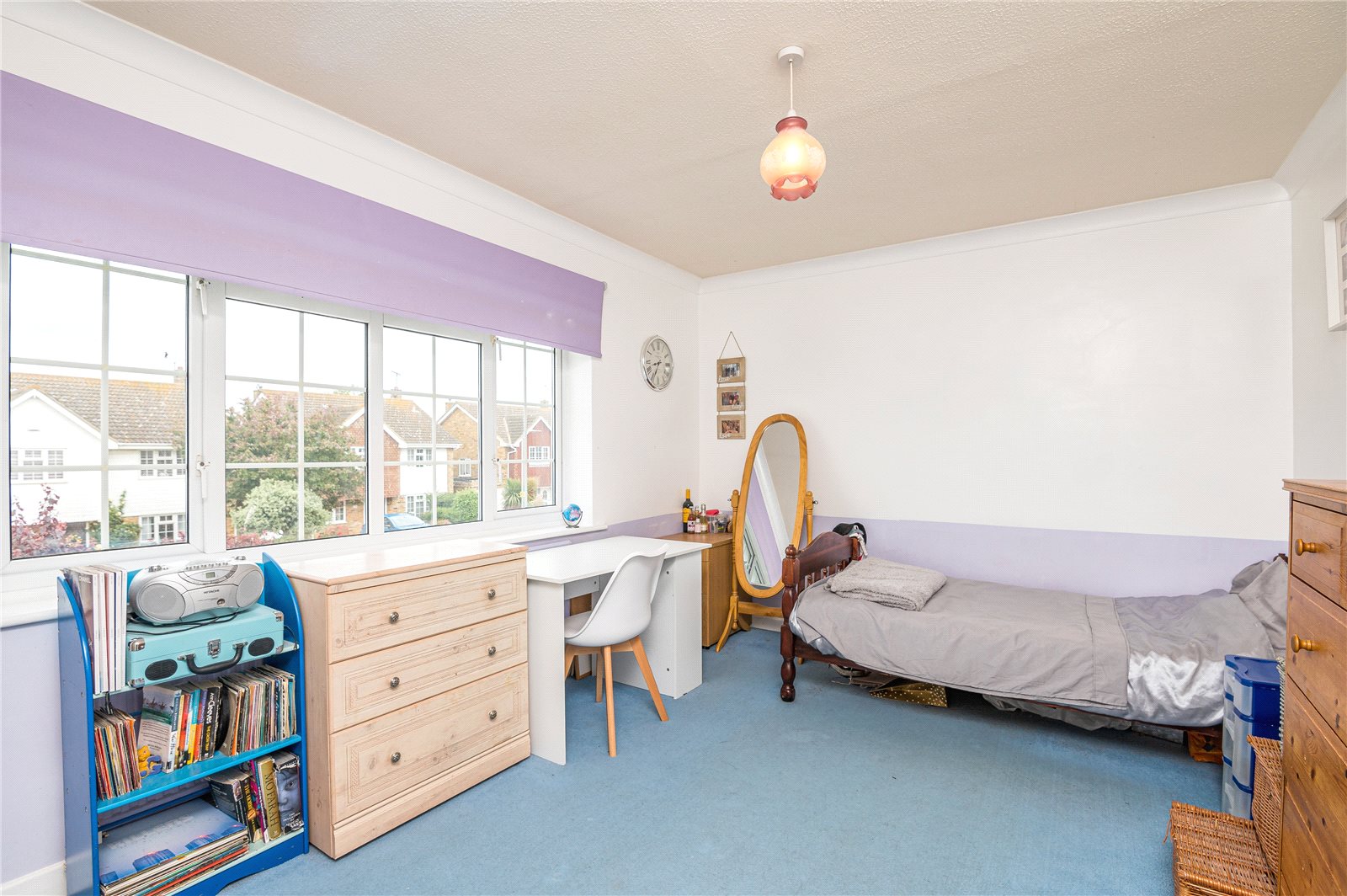 This bright dual aspect room has a double glazed window to rear overlooking the garden and affording wonderful views across the Thames Estuary and Kent Coastline, plus a double glazed door to side leading to the sun terrace. The kitchen is fitted with a wide range of Cream fronted units and extensive work surfaces with inset sink unit with mixer tap. Range of cupboards and drawers below. Built in refrigerator with matching decor panel. Space and plumbing for dishwasher. Inset four ring gas hob with extractor hood above. Built in under oven. Space for freezer. Utility cupboard housing space and plumbing for washing machine. Range of wall mounted storage cabinets. Part tiled walls. Tiled floor. Radiator. Recessed ceiling lighting.
