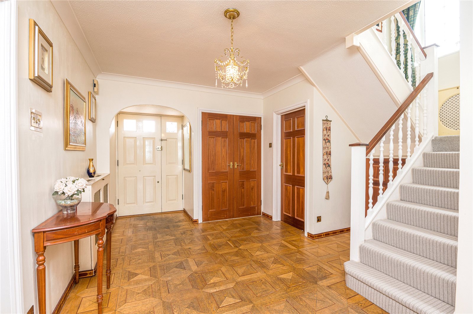 This spacious and inviting reception hall is approached via panelled front doors and covered Porch. Attractive Oak parquet flooring. Turning staircase to first floor with storage cupboard below. Radiator with decorative cover. Coved ceiling. Double built in cloaks cupboard. Doors to accommodation.