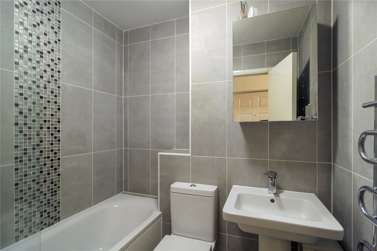 Three-piece stylish bathroom suite comprising of low level wc, enamel hand wash basin with chrome mixer tap and panel enclosed bath with shower screen and chrome shower attachment. Wall mounted heated towel rail. Tiles to floor and walls, with smooth plastered finish to the ceiling, completed with ceiling light.