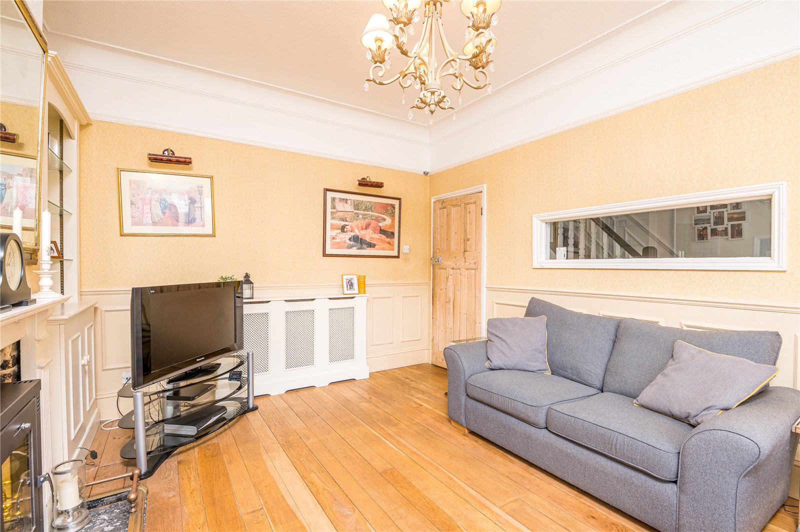 Upvc double glazed bay window with inset blinds to the front aspect. Original coving and ceiling rose. Picture rail. Dado rail with wood panelling under. Feature fireplace. Television aerial point. Radiator with cover. Telephone point.