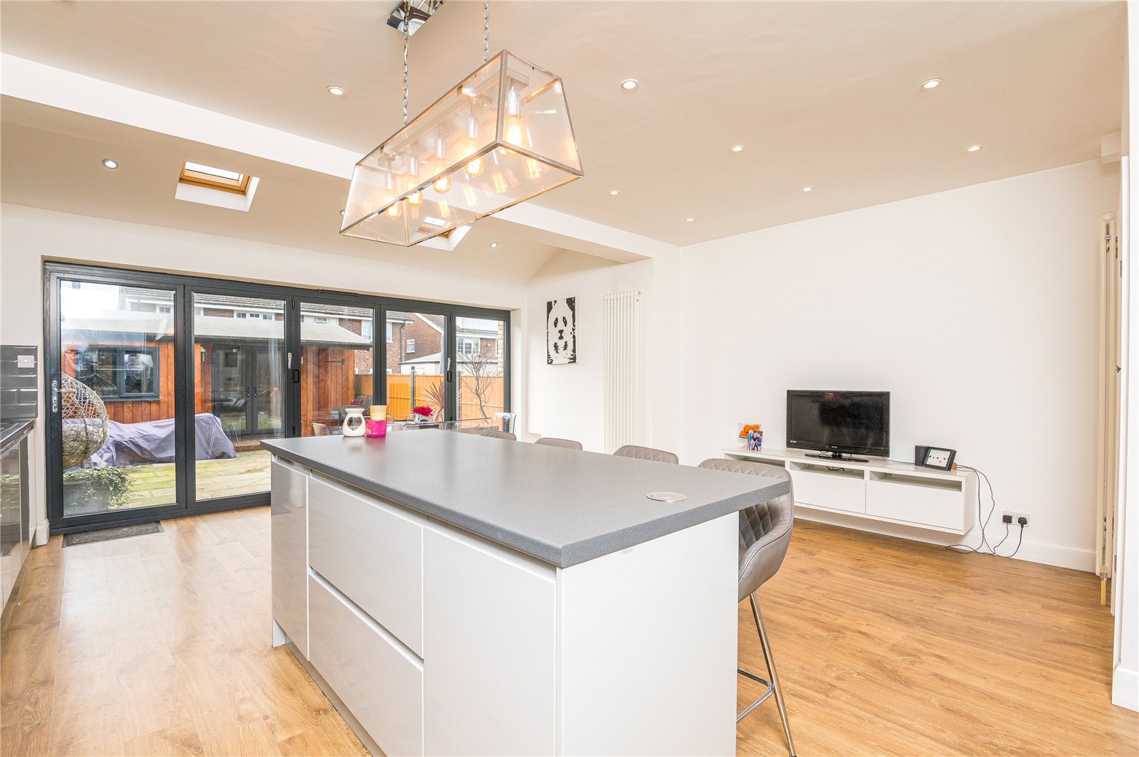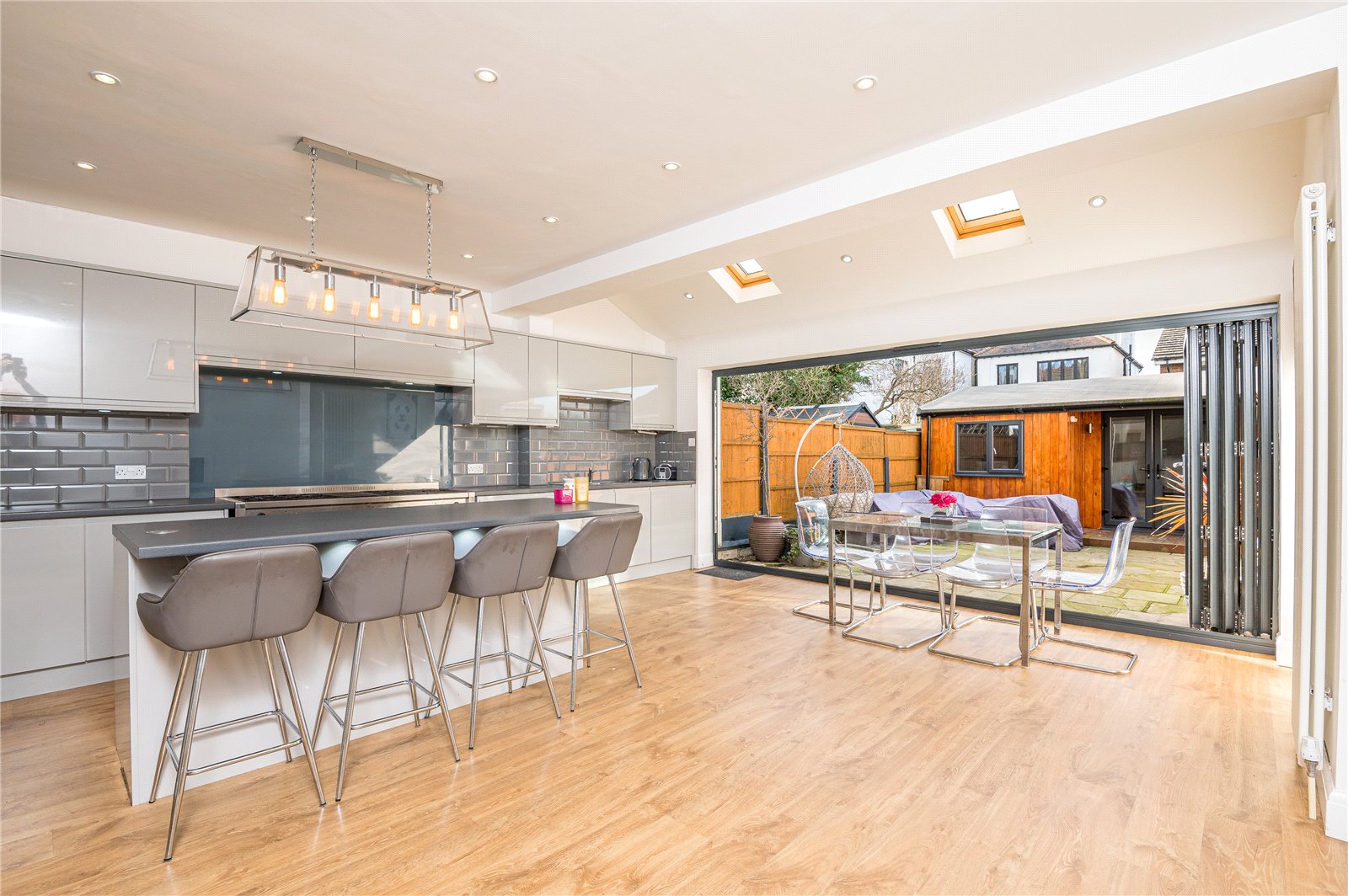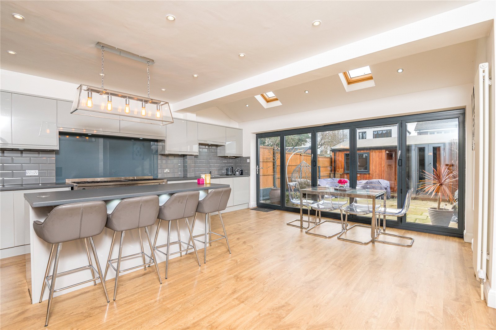 Double glazed bi-folding doors to the rear aspect giving access to the rear garden. Two double glazed ''velux'' sky light windows. The kitchen is modern and fitted with a range of base units with roll edge work surfaces incorporating a stainless steel one and a half bowl single drainer sink unit with mixer tap. Further matching wall mounted storage units with lighting under. Space for oven and fridge/freezer. Integrated microwave, washing machine and dishwasher. Island with breakfast bar. Part tiling to walls. Smooth plastered walls and ceiling with inset spot lighting. Two contemporary vertical radiators. Laminate wood effect flooring.