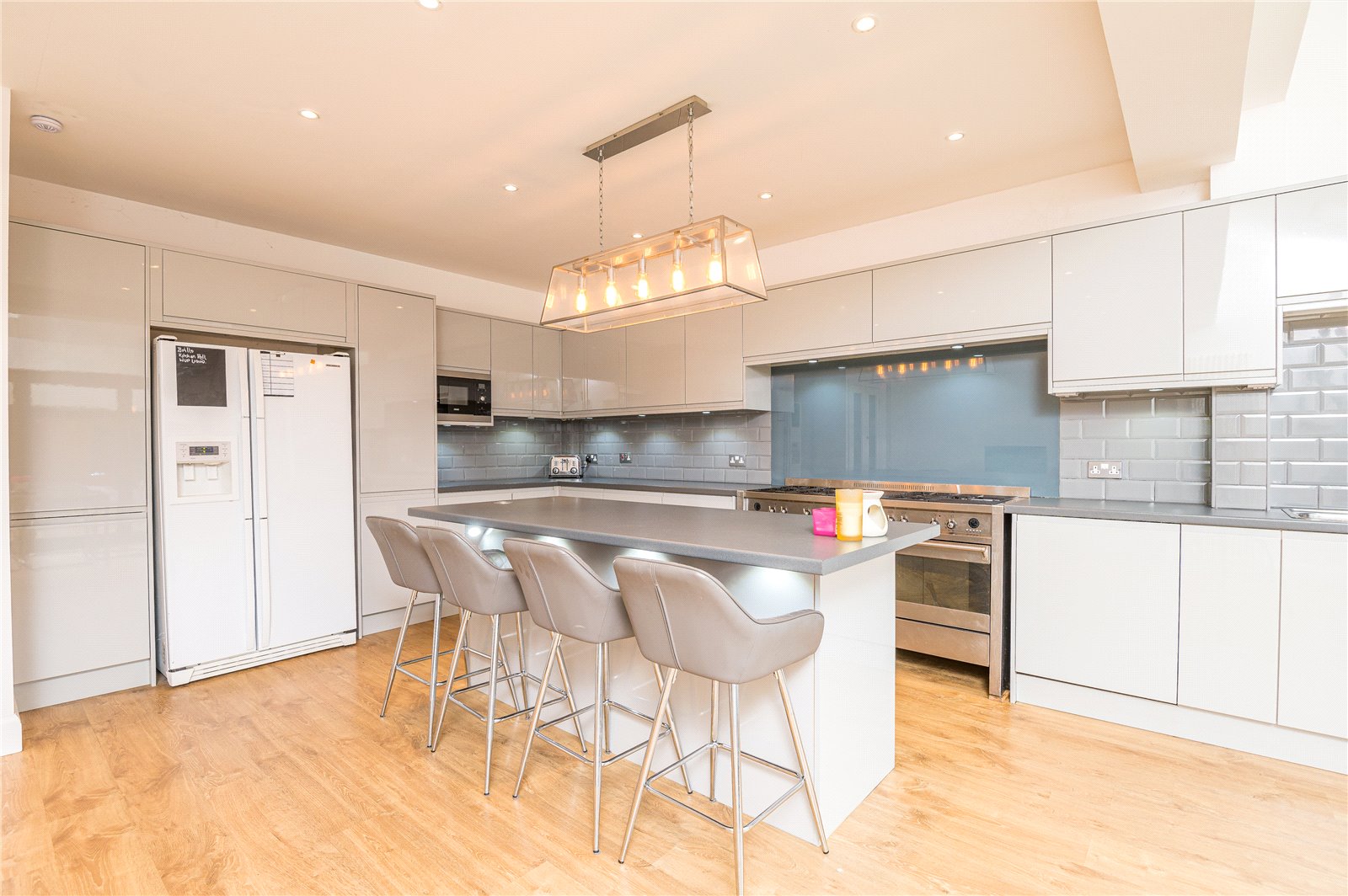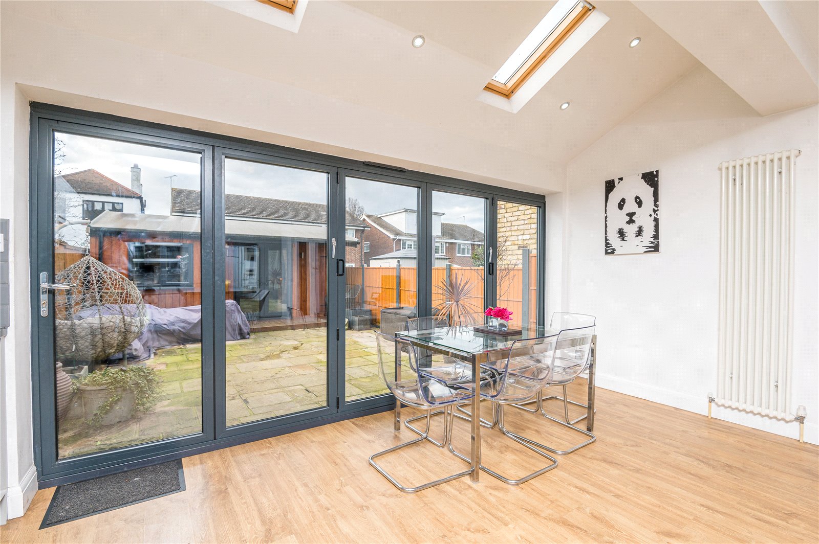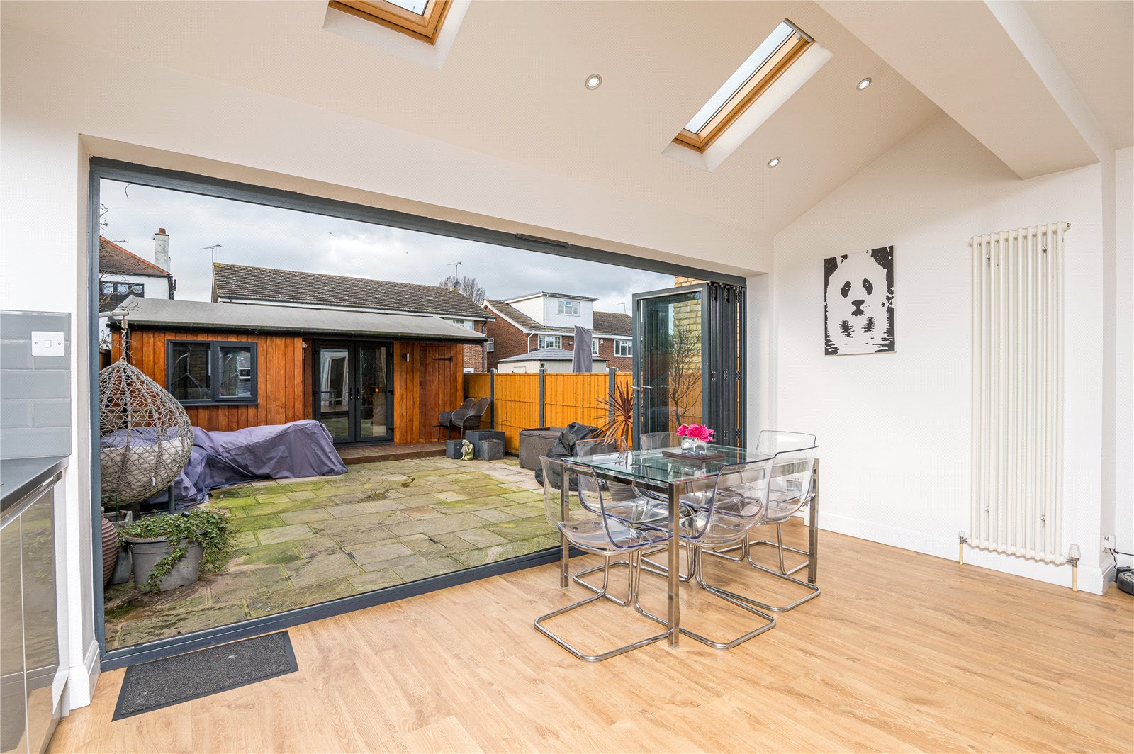 Double glazed bi-folding doors to the rear aspect giving access to the rear garden. Two double glazed ''velux'' sky light windows. The kitchen is modern and fitted with a range of base units with roll edge work surfaces incorporating a stainless steel one and a half bowl single drainer sink unit with mixer tap. Further matching wall mounted storage units with lighting under. Space for oven and fridge/freezer. Integrated microwave, washing machine and dishwasher. Island with breakfast bar. Part tiling to walls. Smooth plastered walls and ceiling with inset spot lighting. Two contemporary vertical radiators. Laminate wood effect flooring.