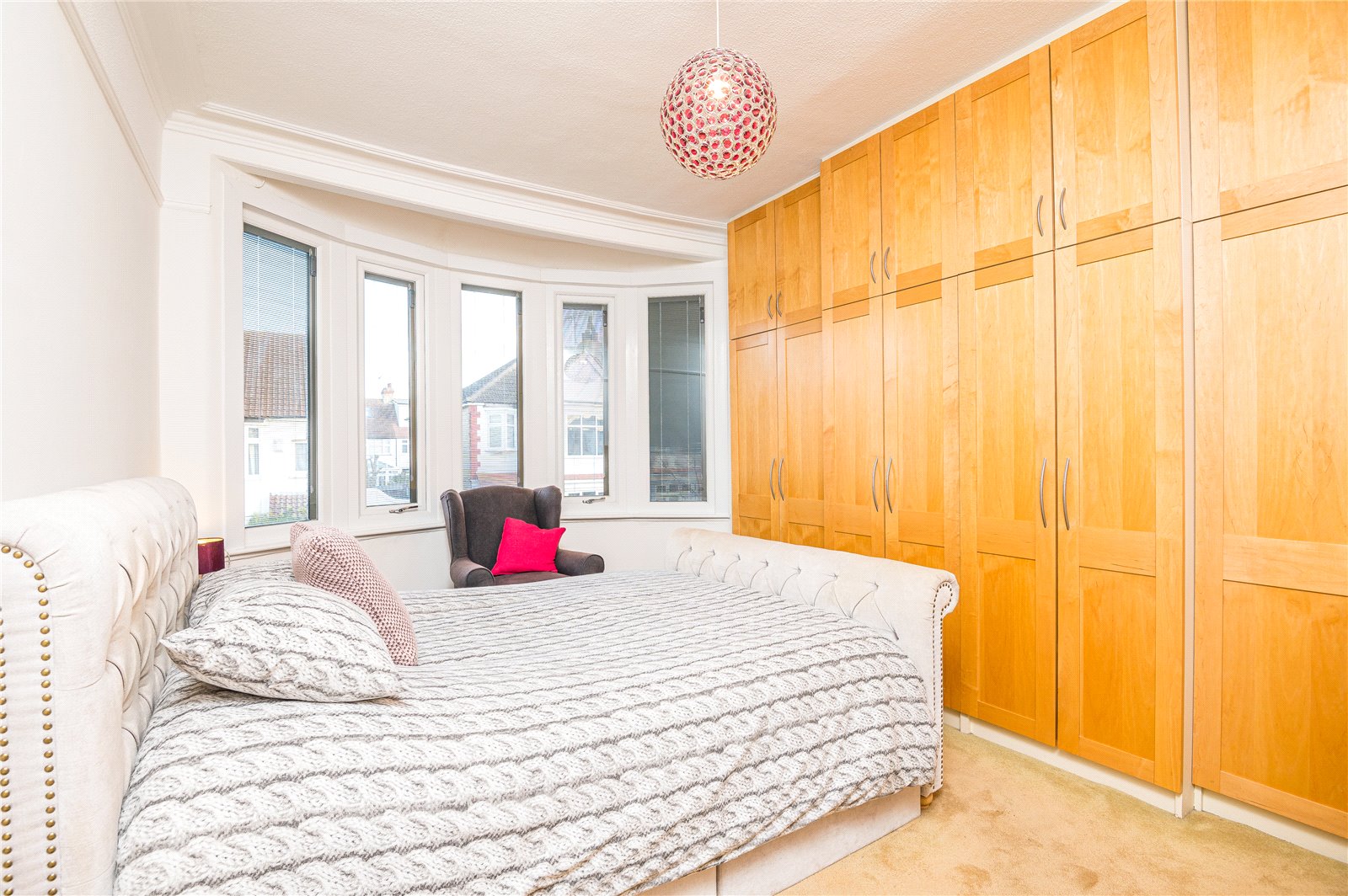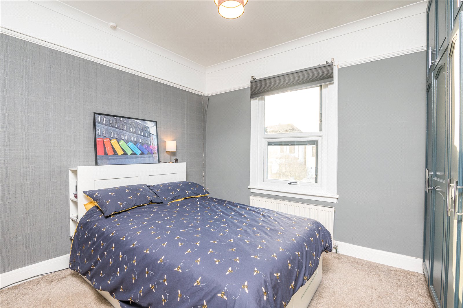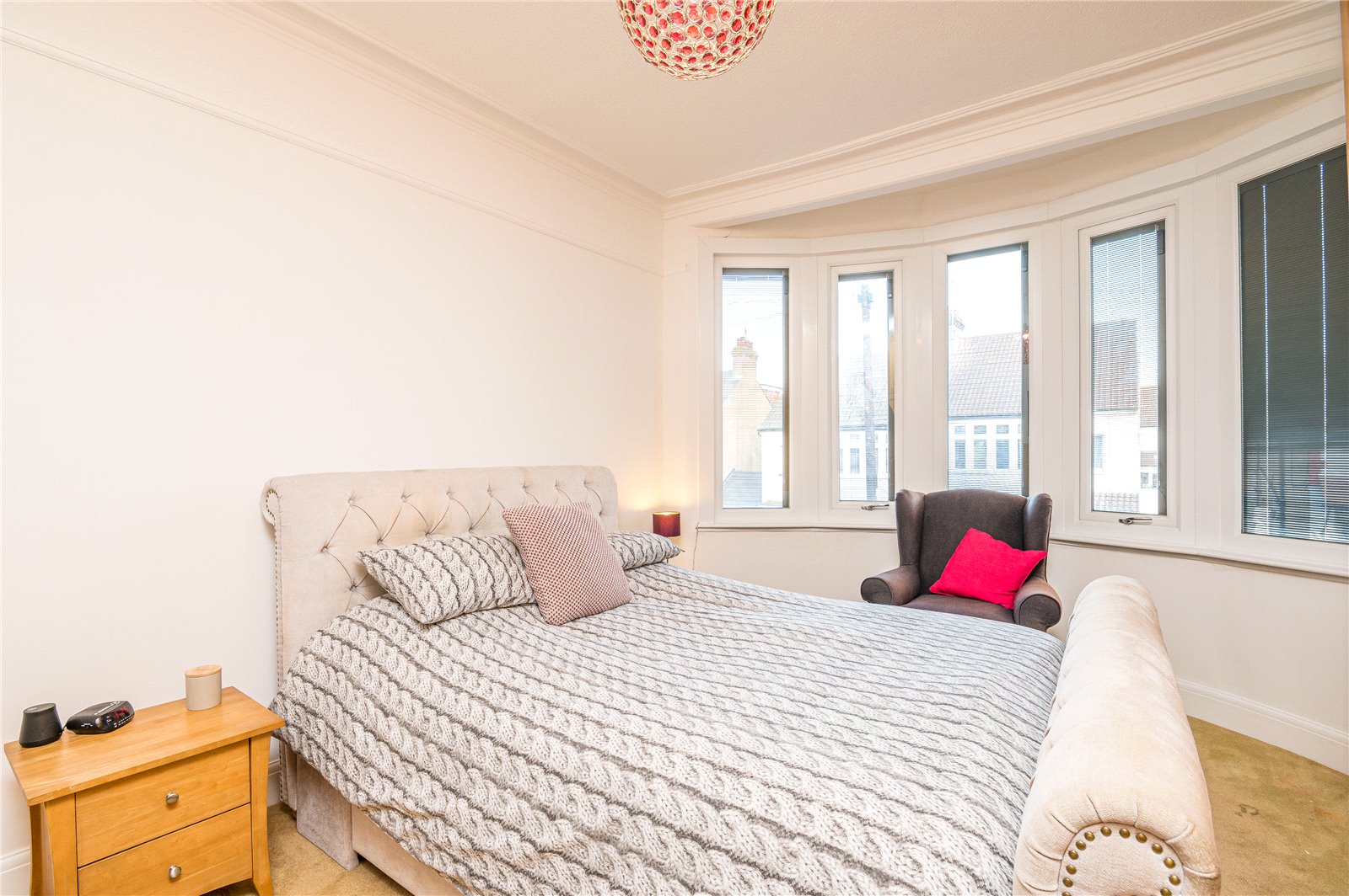 Upvc double glazed bay window to the front aspect with inset blinds. Original coving. Picture rail. Radiator. Range of fitted wardrobes with matching overhead storage cupboards.