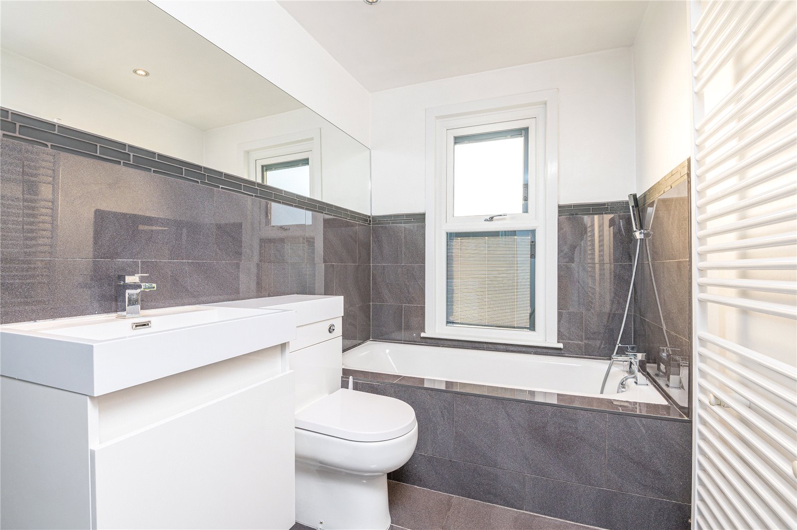 Upvc double glazed window to the rear aspect with inset blinds. Fitted with a modern white four piece suite comprising of tile fronted bath with stainless steel mixer tap and wall mounted shower attachment, vanity wash hand basin with cupboard under and stainless steel mixer tap, low level w.c with concealed sistern and tiled shower cubicle with wall mounted shower unit, plus hair rinser and sliding door. Ceramic tiled floor. Smooth plastered walls and ceiling with inset spot lighting. Part tiling to walls. Heated towel rail. Airing cupboard housing hot water tank.