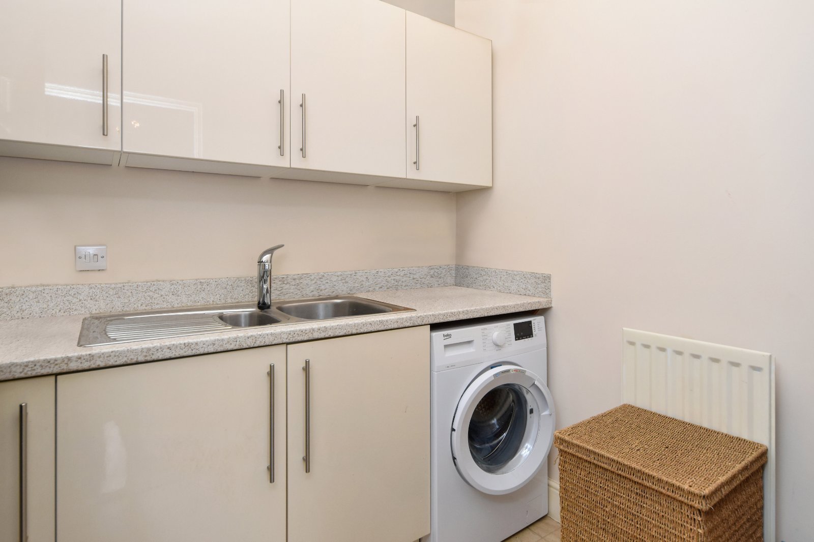 The Utility Room comprises a range of high gloss eye and base level units to one aspect, with square edge working surfaces over with matching upstands inset with 'one-and a quarter' stainless steel sink unit with mixer tap over and single drainer. Under counter appliance space for washing machine. Further under counter storage cupboards. Smooth plastered ceiling inset with ceiling mounted extractor fan.