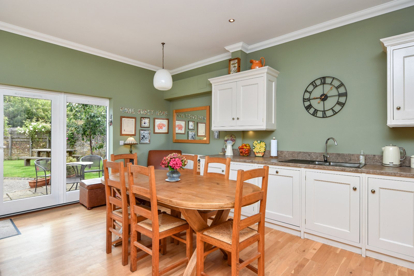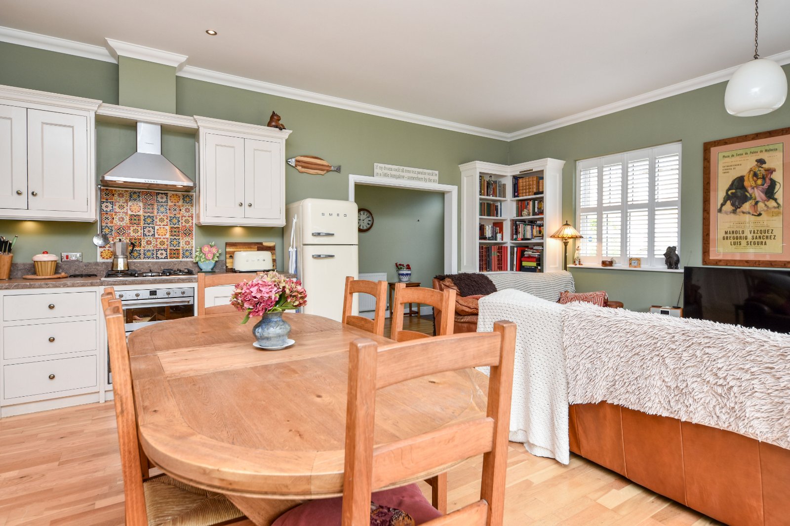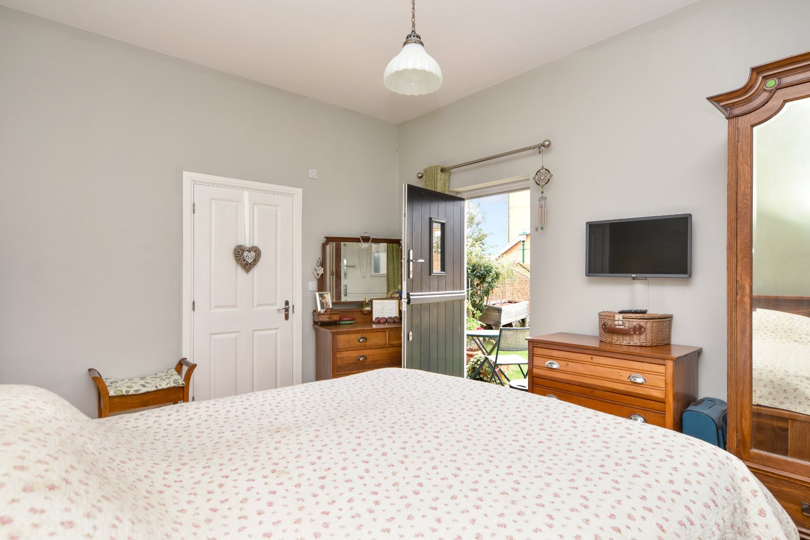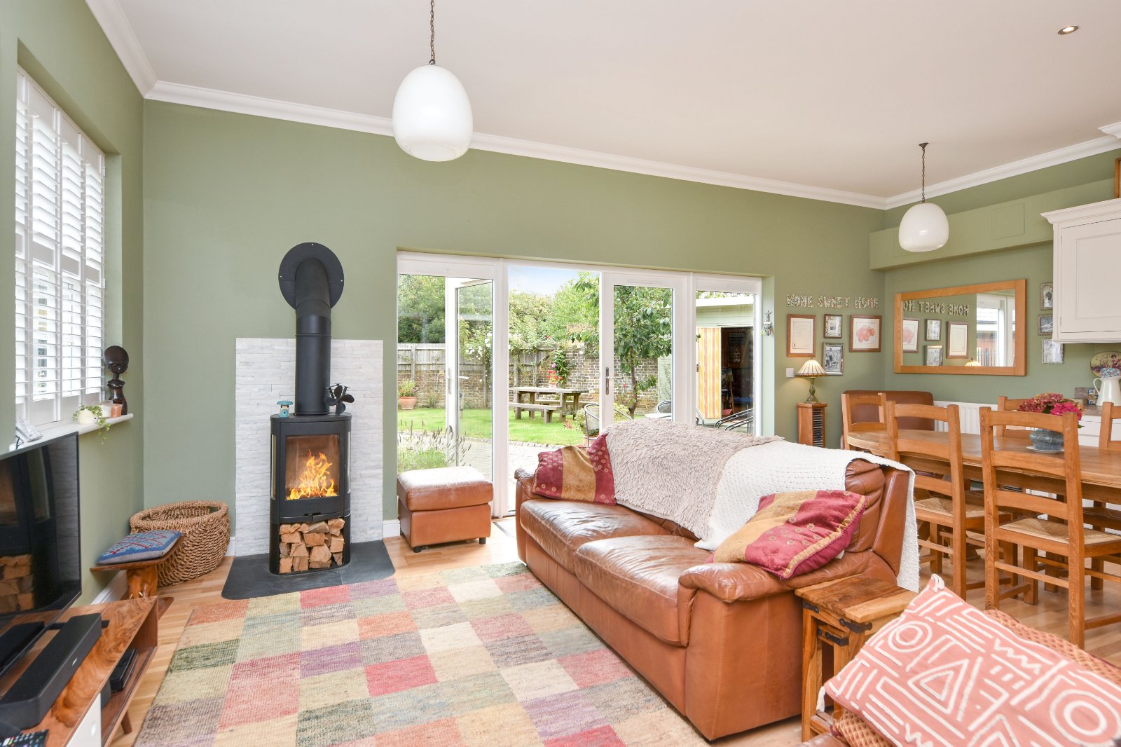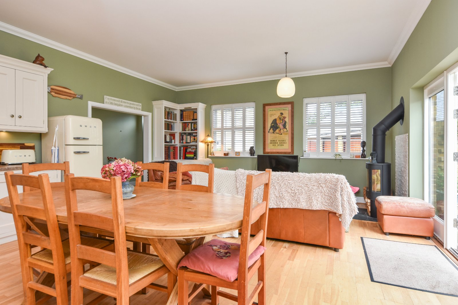Pair of double glazed sash style windows to side aspect inset with impressive made to measure plantation blinds. Pair of french double glazed doors providing access to 'Kitchen Garden' with matching double glazed panel to either side. Superb professionally installed 'wood burning' stove with external chimney flue, tile back plate and marble hearth. Feature engineered oak wood flooring. Radiator. Smooth plastered ceiling.